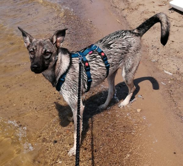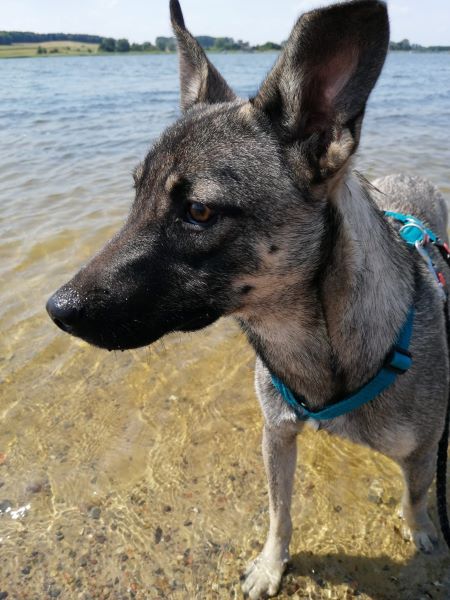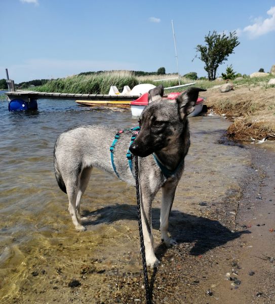 Sie liebt ausgiebige Spaziergänge im Wald oder am Strand wo sie an der Schleppleine nach Herzenslust rennen oder buddeln kann. Pili läuft super an der Leine, hört gut auf ihren Namen und ist prima abrufbar.