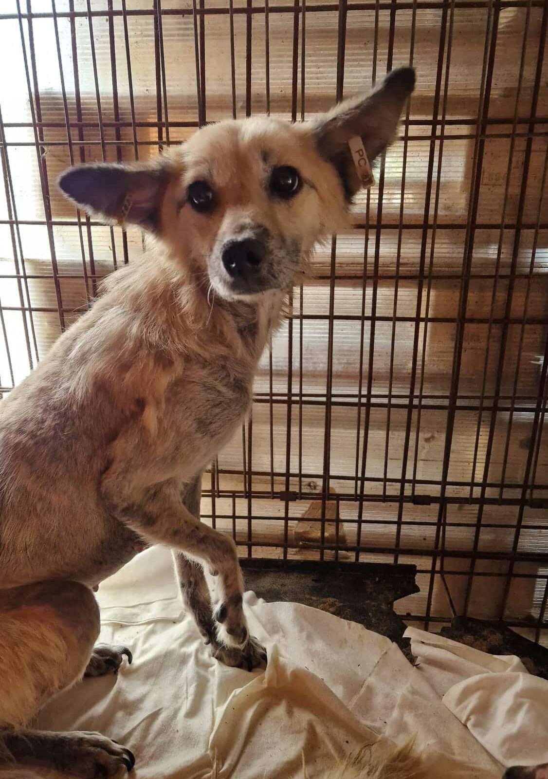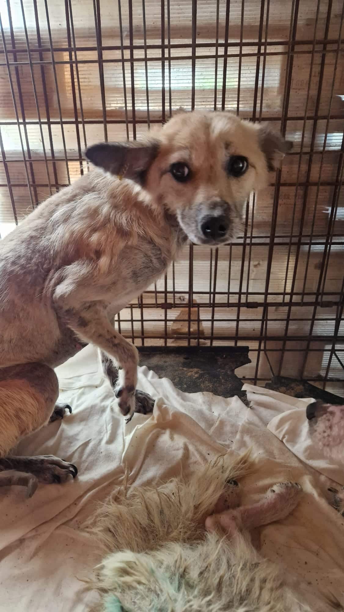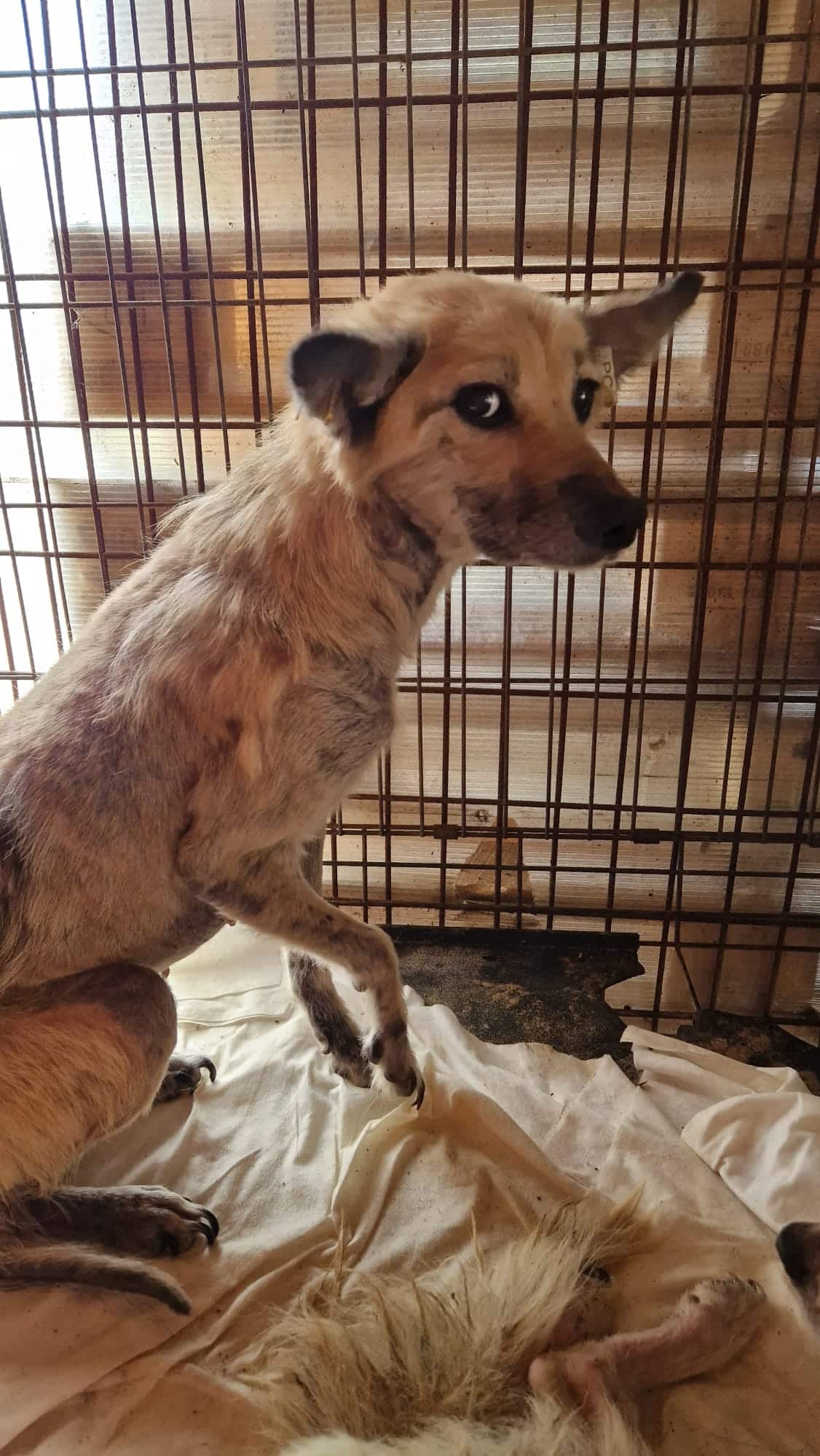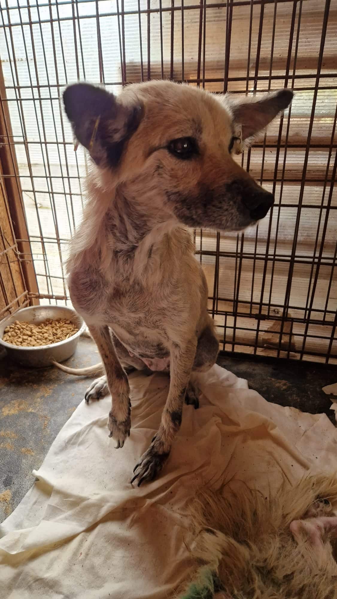 Die süsse Maus PINKY ist in ärztlicher Behandlung. Ihre Hauptprobleme, die großflächig waren, sind bereits am Abklingen, sie hat aber noch ordentlich Kruste auf dem Rücken (Stand Ende April 2024). Sie konnte ihr rechtes Vorderbein nicht richtig aufsetzen und hat in ihrer engen Box kaum Platz, sich hinzulegen, da sie sich diese noch mit einer alten Hündin teilt. Beide haben Hautprobleme und müssen Tag und Nacht in der Box sitzen, weil im Kennel über 30 Welpen auf dem Boden rumwühlen.