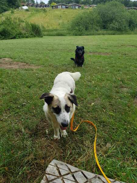 Gassigehen mit allen dazugehörigen Handhabungen findet er richtig klasse. Mittlerweile geht er einigermaßen manierlich an der Leine. Der Rückruf an der Schleppleine wird immer noch kurz überdacht und selbst das bereitgehaltene Leckerchen treibt ihn dann nicht zur Eile an. Sicherlich ist das ein Merkmal seines Charakters. Nichts überstürzen, langsam kommt man auch ans Ziel. Ein Gemütshund durch und durch.