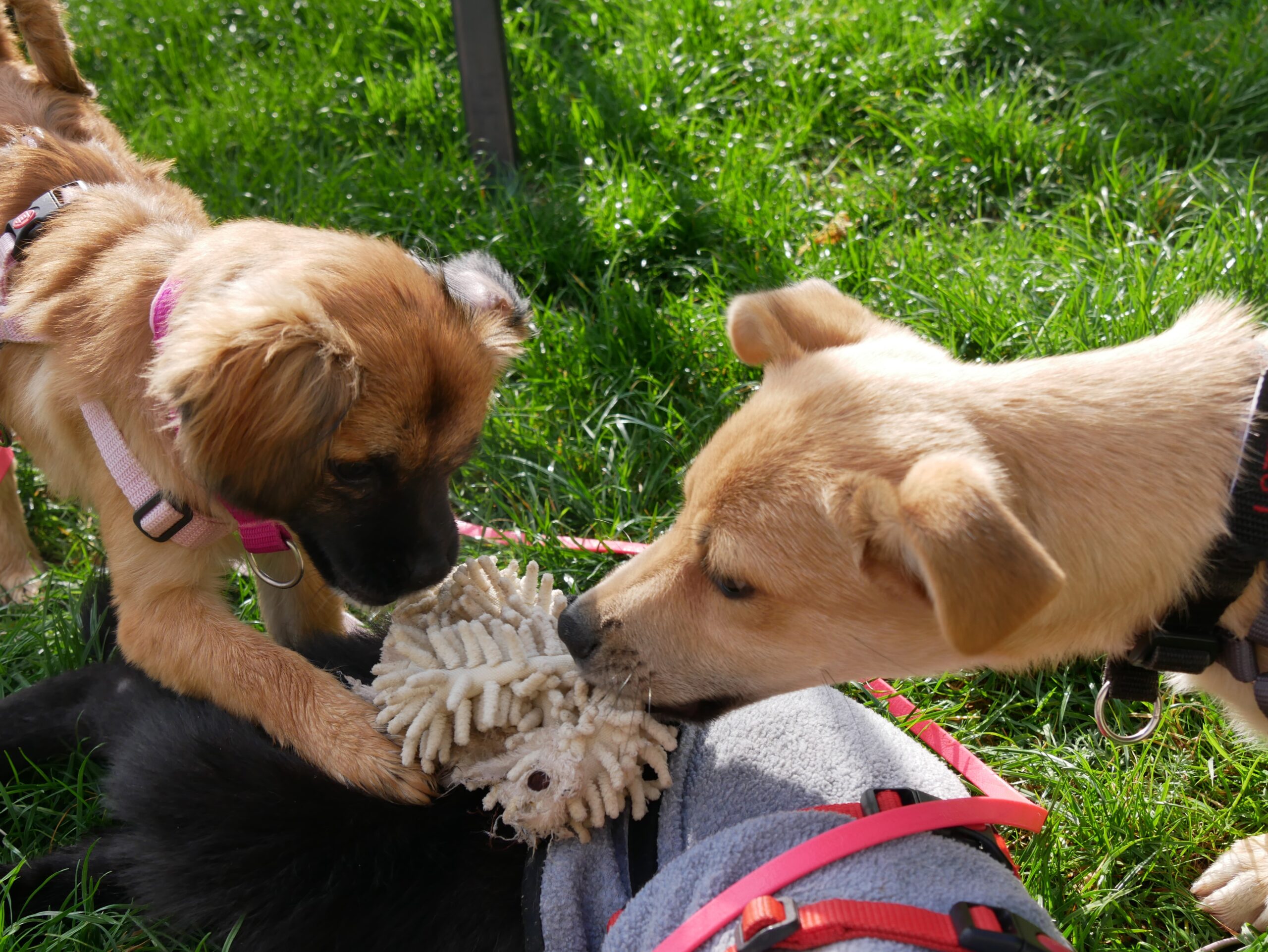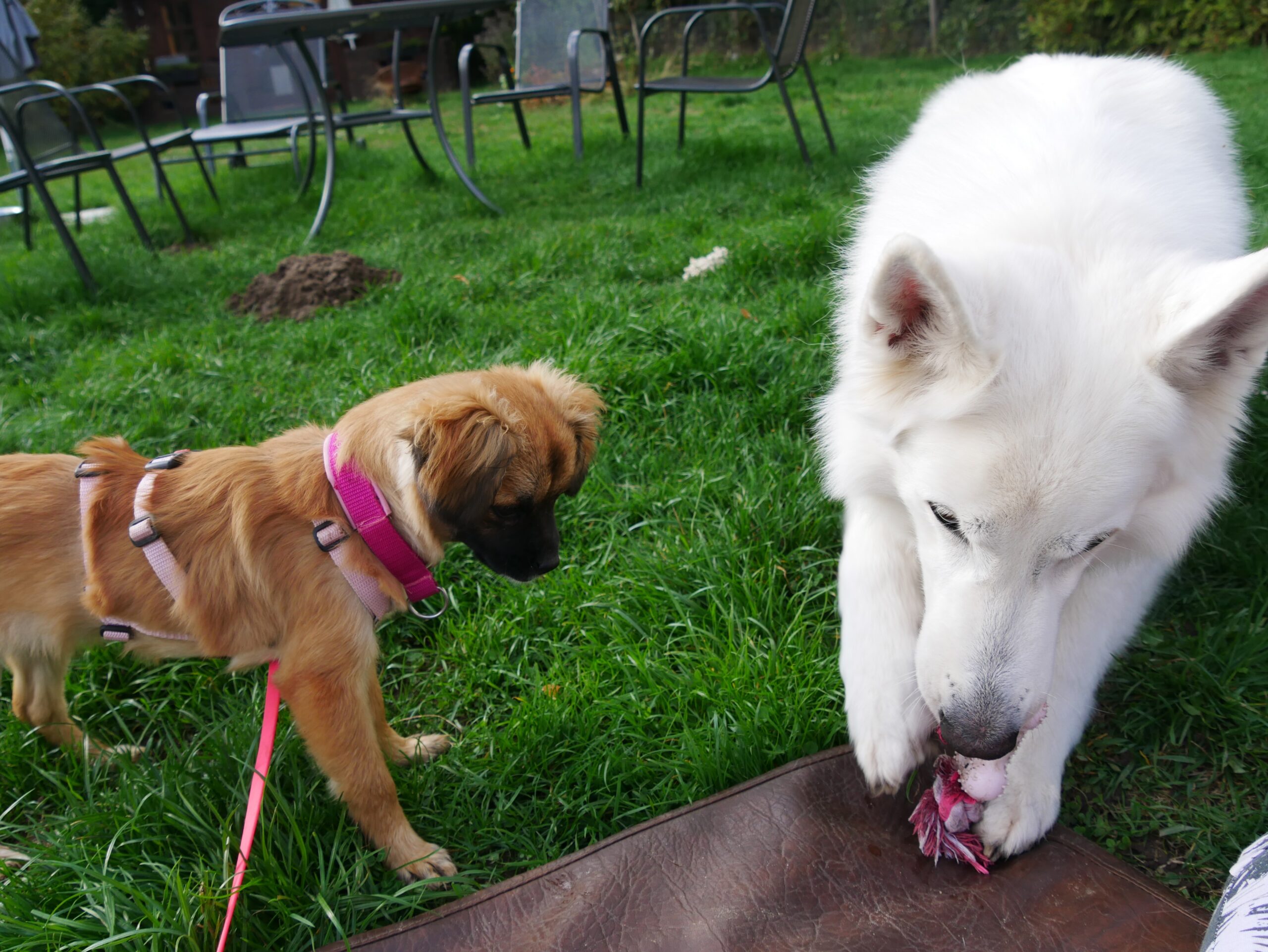 Mit ihren Pflegestellen-Geschwistern oder mit dem Pflegefrauchen tobt sie durch den Garten und zeigt sich als keckes kleines Mädchen. Man sieht erste Ansätze, dass sie Spaß am Apportieren hat.