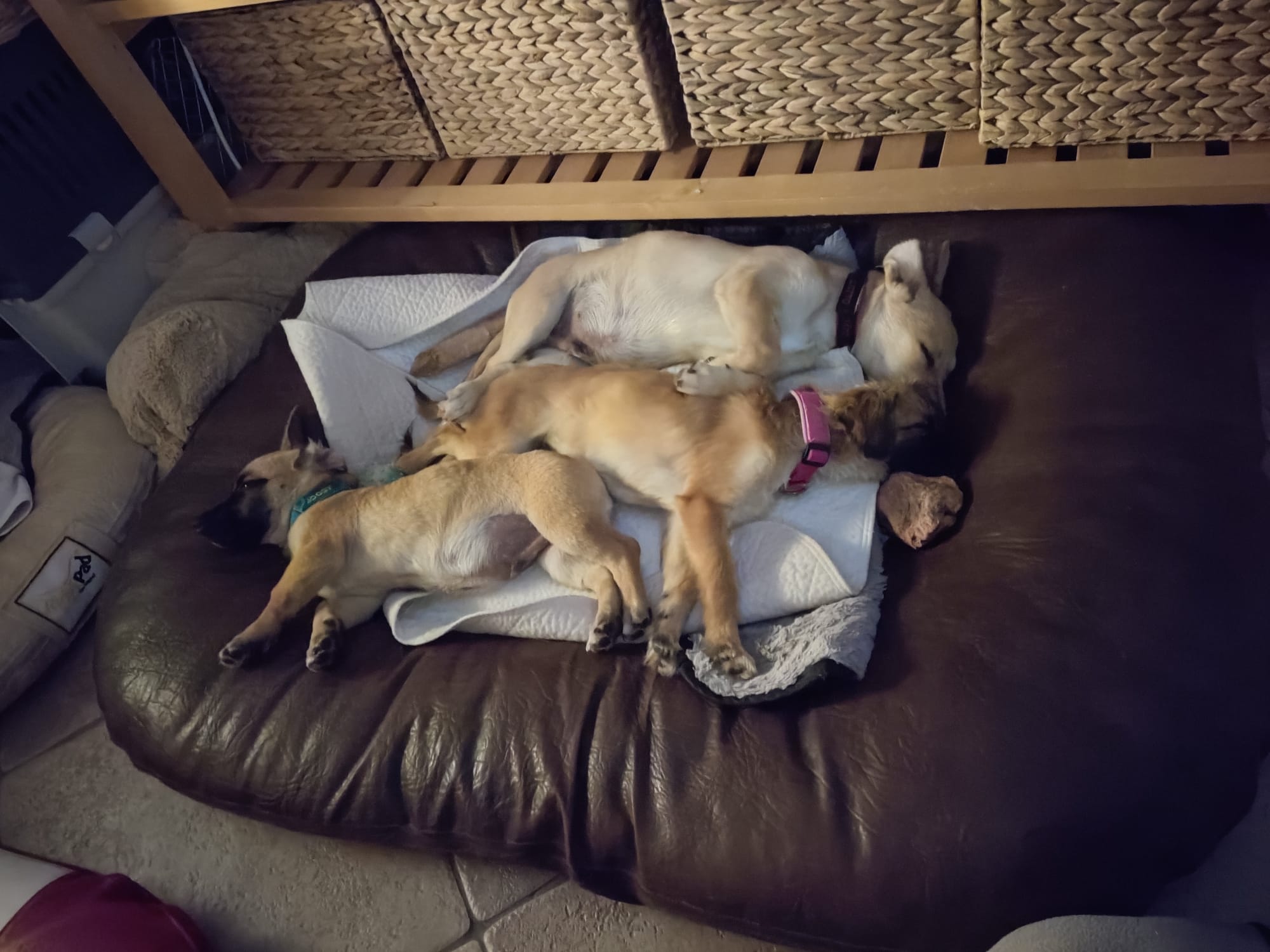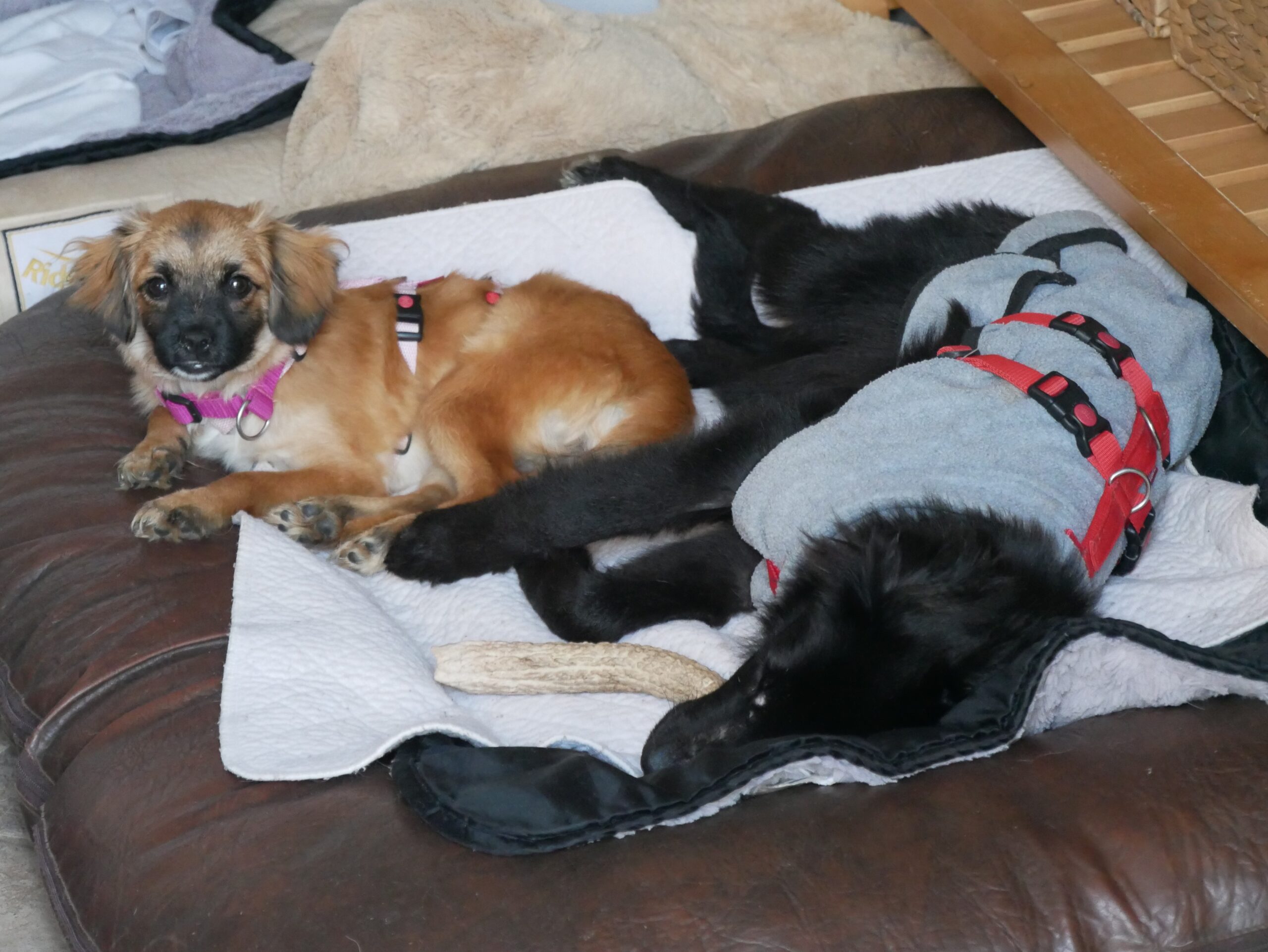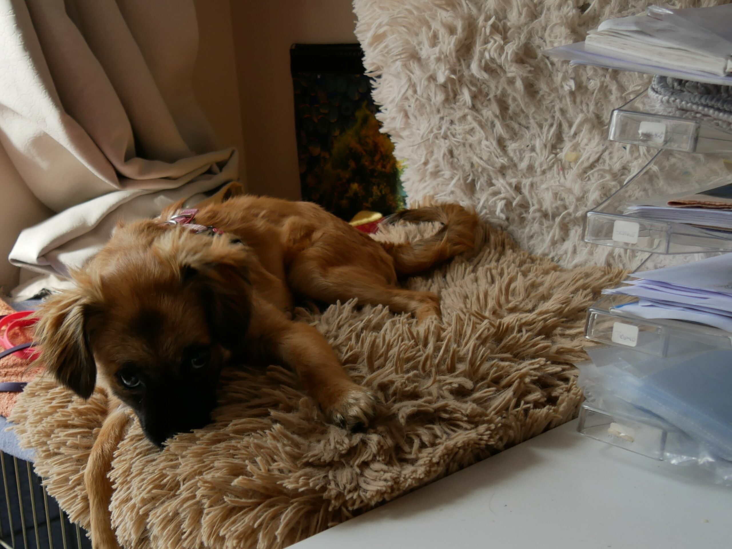 Sie ist hier mit im Büro, legt sich ab und wartet, bis wieder Action angesagt ist. Abends, wenn Ruhe einkehrt, liegt sie gerne mit den Pflegestellen-Schwestern und / oder dem Pflegemenschen auf dem Kronenkissen. Kuscheln und Bäuchlein kraulen ist dann ein Muss.