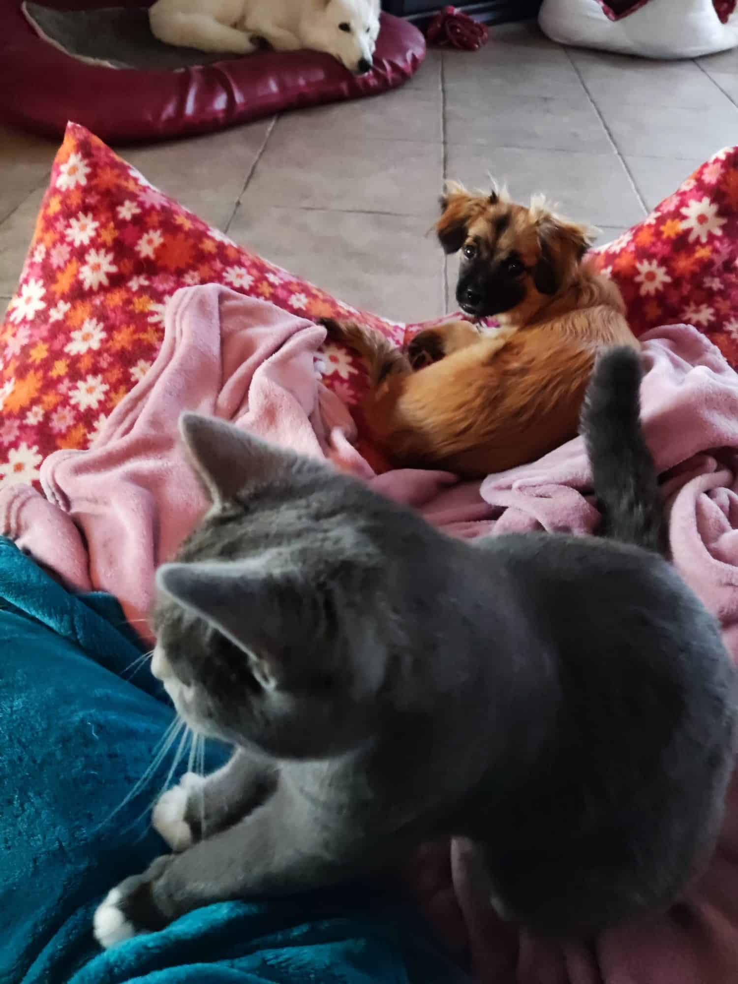 Mit den Katzen im Haus klappt es ebenfalls gut; sie liegen zusammen im Körbchen. Draußen mag sie ihnen hinterherlaufen; da unsere Katzen sehr entspannt sind, passiert jedoch nichts weiter.