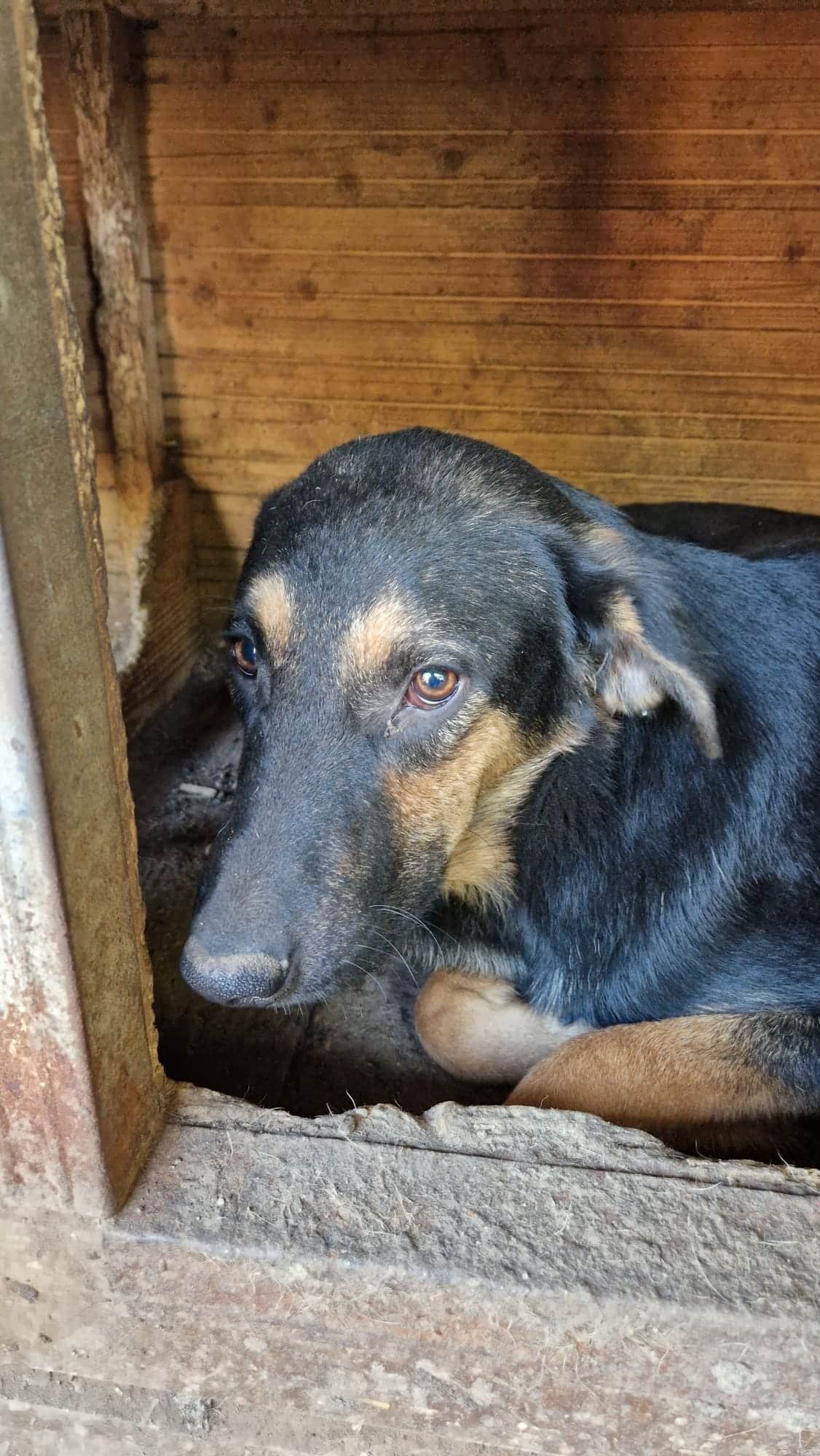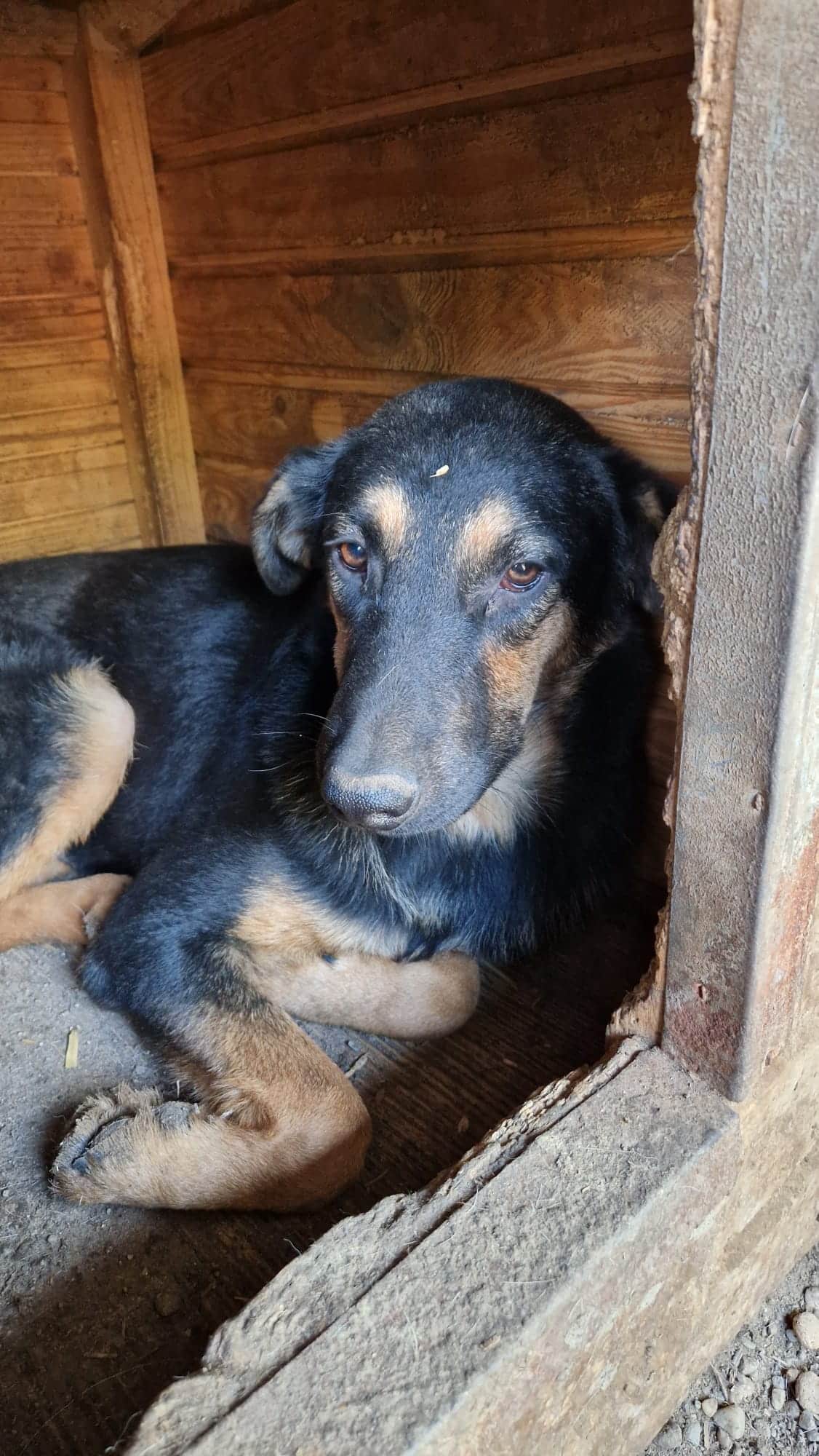 Traurig und zurückgezogen haben wir POPPY in einer Hütte entdeckt. Er macht einen fertigen Eindruck, lässt sich aber weiterhin streicheln und freute sich dann über die mitgebrachten Leckerlis. Ein lieber Kerl, der ein sehr einsames Leben dort führt.