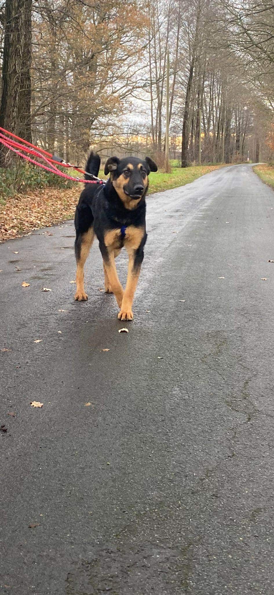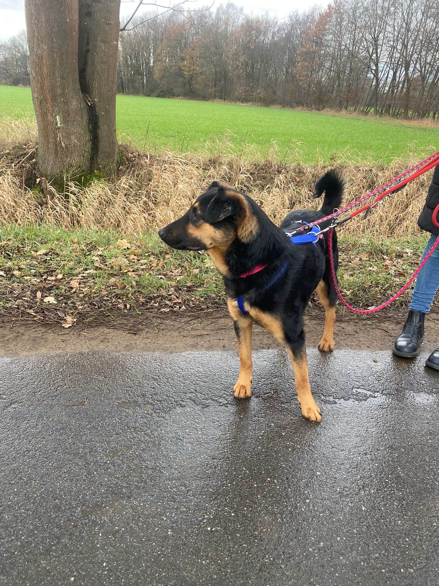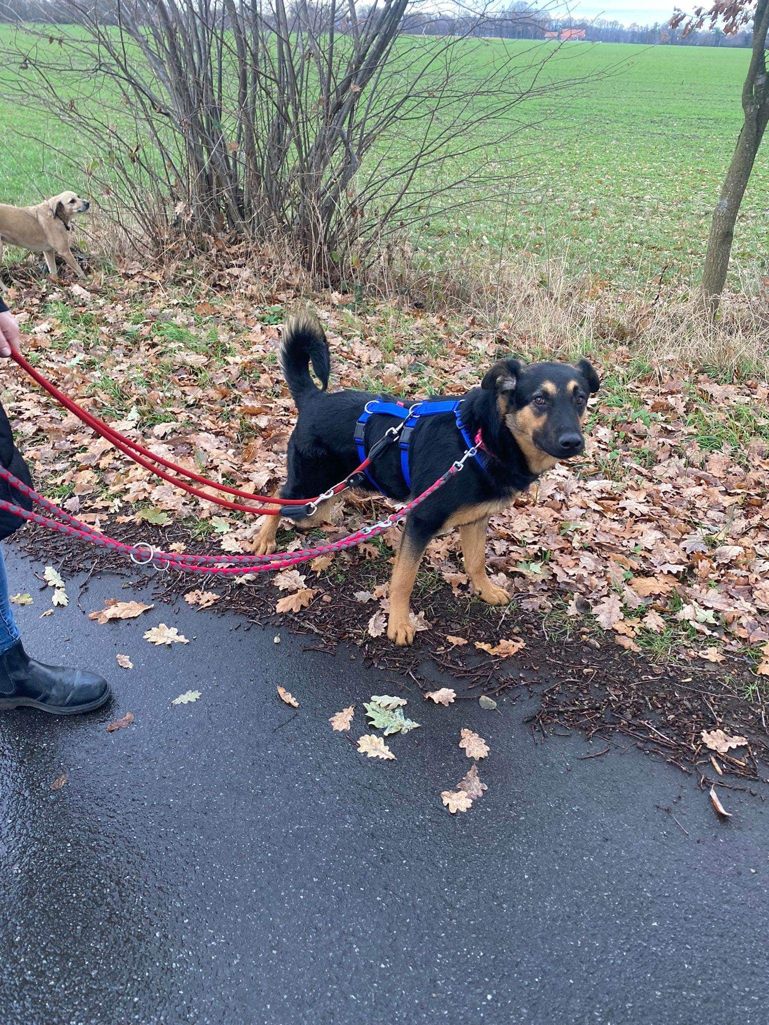 Die Spaziergänge macht er sehr gut. Er läuft schön an der Leine und zeigt keine Angst oder Unsicherheit.