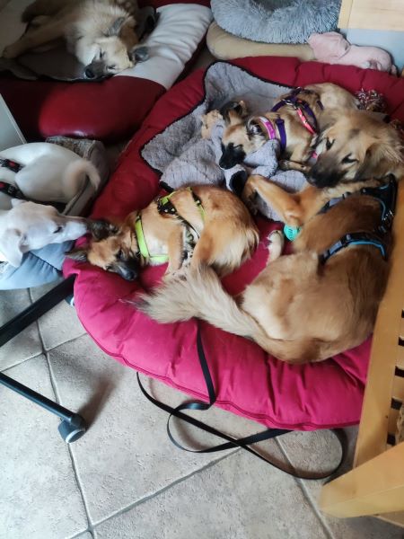 Die hundeverständigen Katzen mag sie, prüft gerne mal, was die so auf dem Speiseplan hatten und säubert ihnen das Gesicht. Unsere Katzen lassen es zu, es ist für sie normal. Sie leben hier im Haus in schöner Einigkeit. Gerne wird auch gemeinsam geruht.