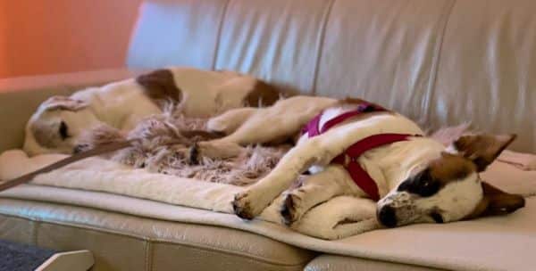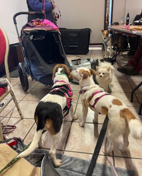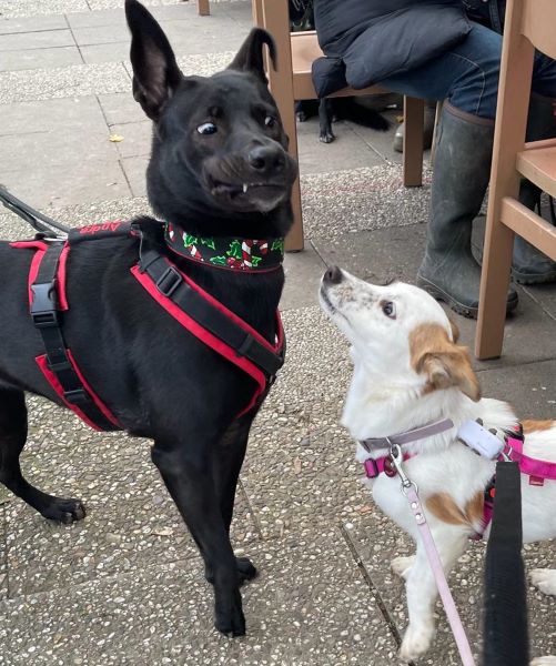 Sie ist sehr verträglich mit Artgenossen, wobei sie den Kontakt mit Hunden ihrer Größe bevorzugt. Große, ungestüme und distanzlose Hunde machen ihr Angst. Lässt man ihr Zeit zum Kennenlernen und sind es ruhige, souveräne große Hunde, die sie in Ruhe lassen, läuft sie problemlos an der Leine in einer Gruppe mit. Bei uns im Umfeld ist ihre große Liebe ein in sich ruhender Cane Corso Rüde.