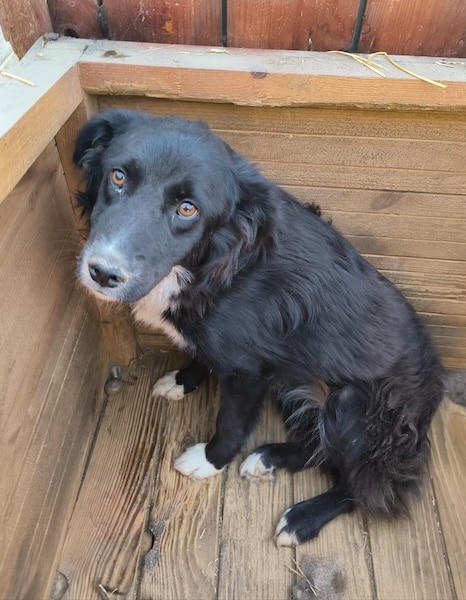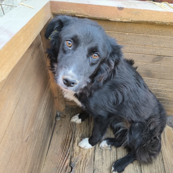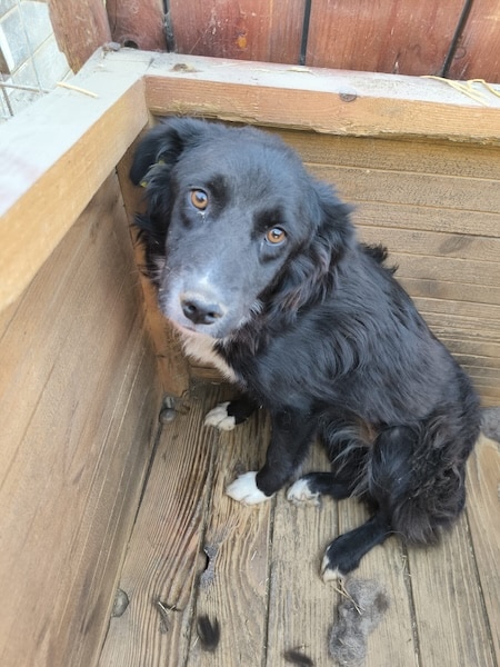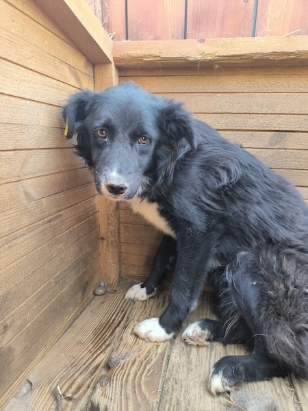 Diese Hündin sitzt zusammen mit Rüden und Hündinnen in einem Kennel. Sie hat an der rechten Seite eine abheilende Bissverletzung.