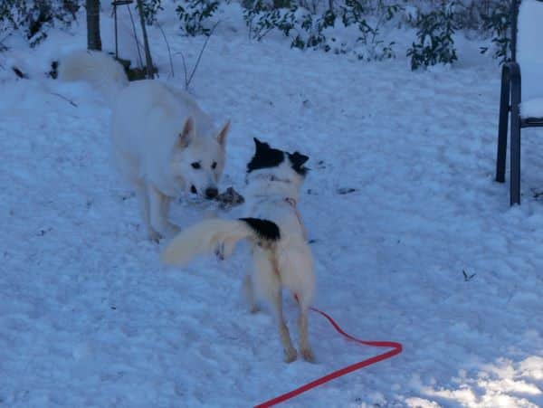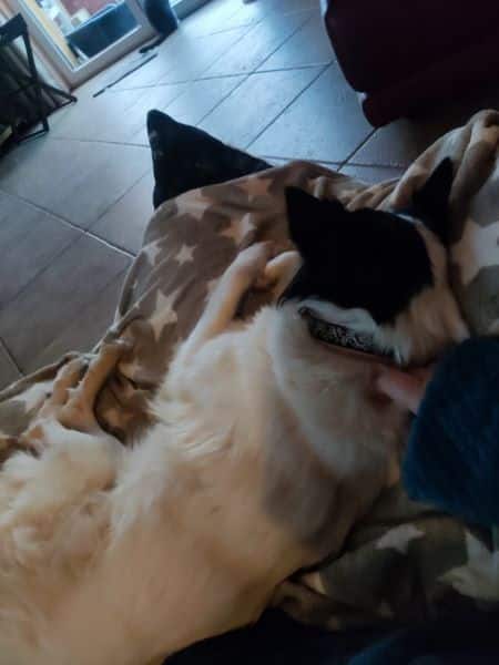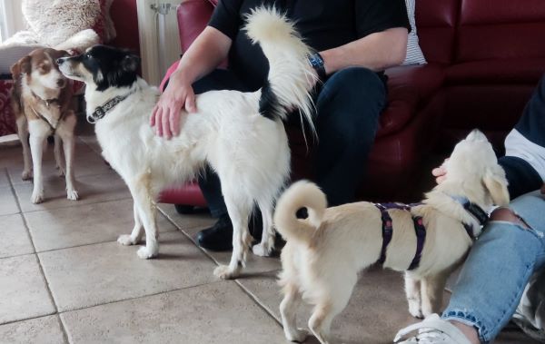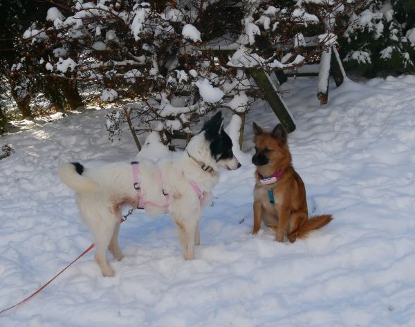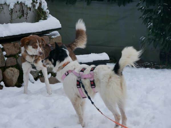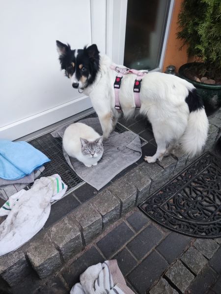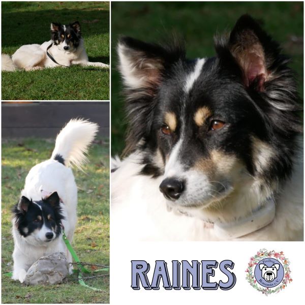 Hier bei uns im Rudel hat sie inzwischen ihre liebste Freundin Roosalie; mit ihr tobt und kabbelt sie sich, fordert sie zum rennen und spielen auf. Das war nicht gleich von Anfang an so; es hat ein Weilchen gedauert und musste gut begleitet werden. Umso schöner ist es jetzt, die beiden so harmonisch zusammen zu erleben. Sicherlich kann Raines so auch einen anderen Artgenossen mögen lernen, es braucht aber vermutlich auch wieder etwas Zeit und Begleitung. Mit den jüngeren Hunden hat sie eher weniger im Sinn, wobei auch das jetzt entspannter wird und die sich auch schon mal mit ins Spiel einbringen dürfen. Die Leithündin hier wird respektvoll beachtet und die Katzen indoor liebevoll beschmust.