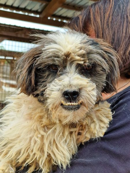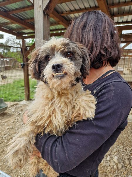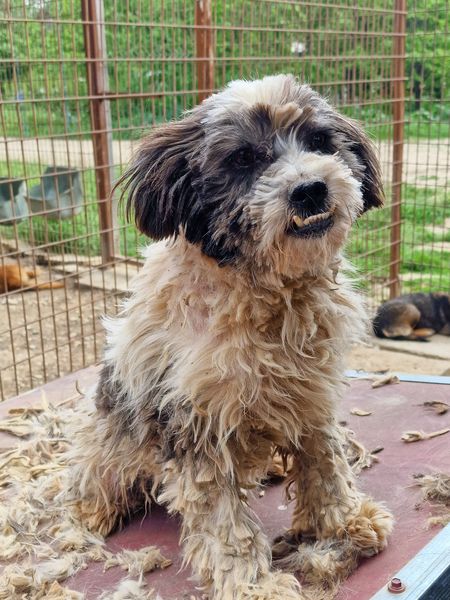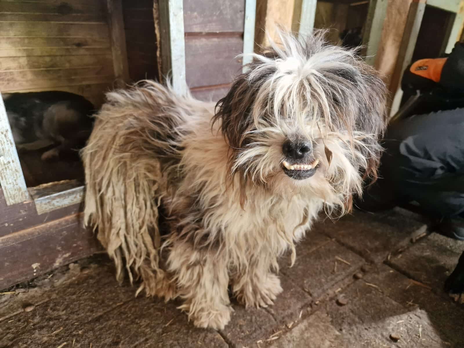 Dieser kleine Kerl fällt sofort durch seinen sympathischen Unterbiss auf. Er saß anfangs nur in der Hütte, nahm aber sofort gerne Leckerchen und ließ sich auch ohne Probleme streicheln. Er kam dann auch aus der Hütte, die Neugierde hat dann doch gesiegt, und holte sich seine Streicheleinheiten ab. Leider ist er sehr stark verfilzt und muss dringend geschnitten werden. Daher sind wir einen Tag später nochmal zu ihm hin und haben das Gröbste bereits versucht wegzuschneiden.