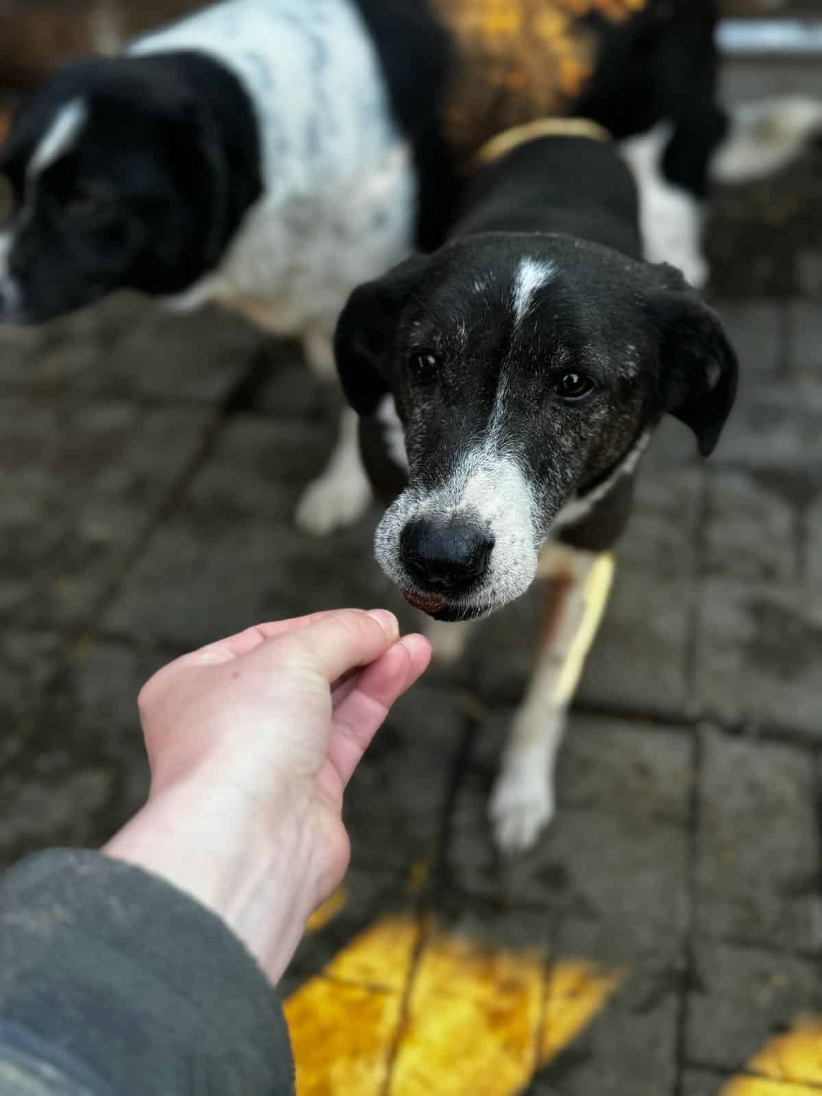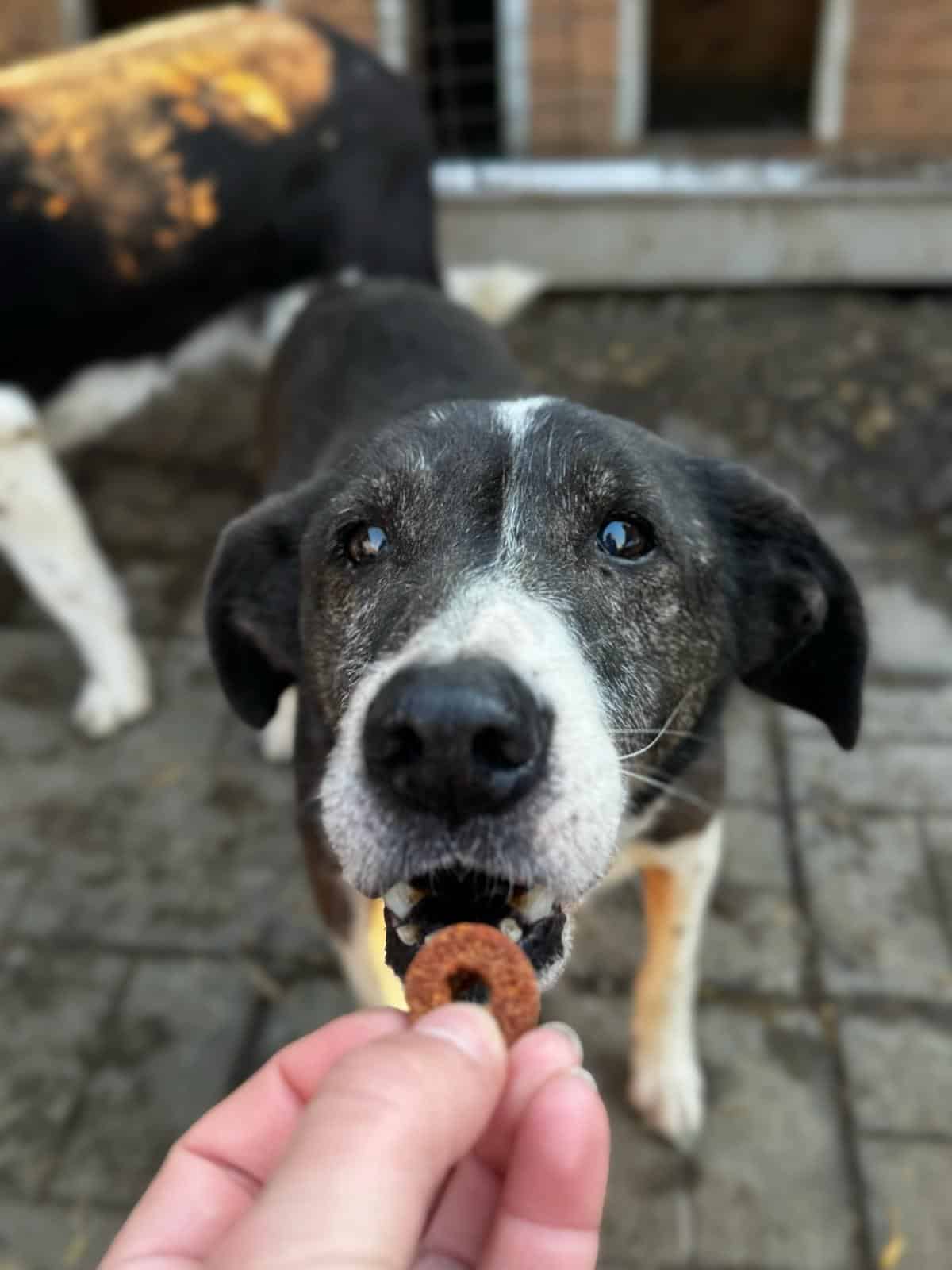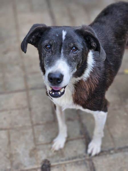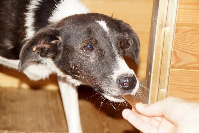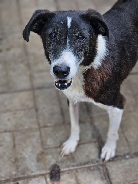 RANDIE wirkte bei unserem Besuch müde und er scheint langsam abzubauen. Sie Gesicht ist schmal und die Haare um die Nase grauer geworden. Er ist immer noch ein interessierter und sehr netter Rüde, der sich über die mitgebrachten Leckerchen sehr gefreut hat. Er nimmt sie aus der Hand und lässt sich dabei vorsichtig an der Nase anfassen. RANDIE bräuchte Zeit! Zeit, die er bald nicht mehr hat.