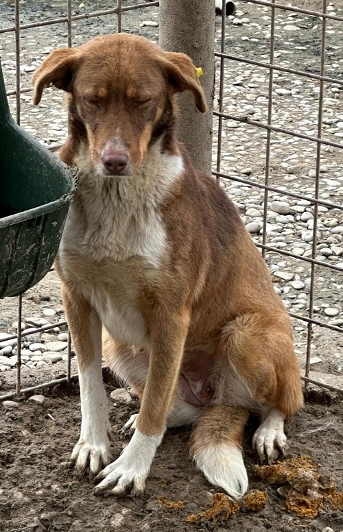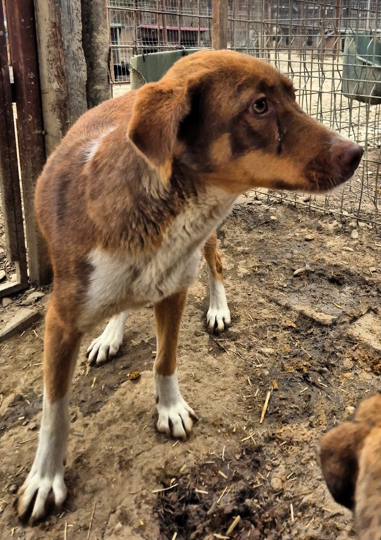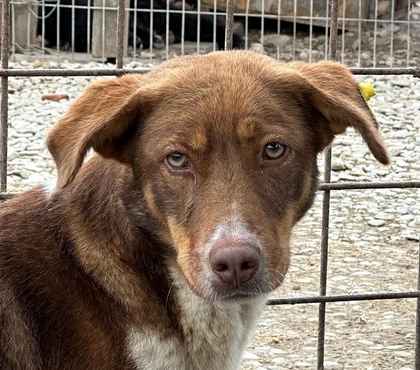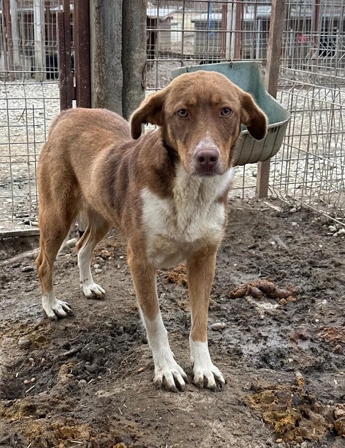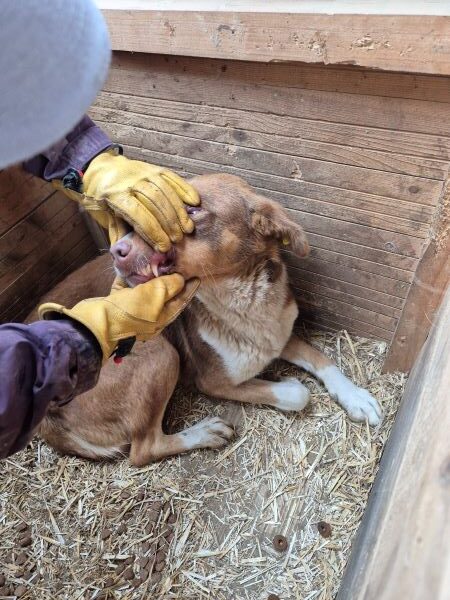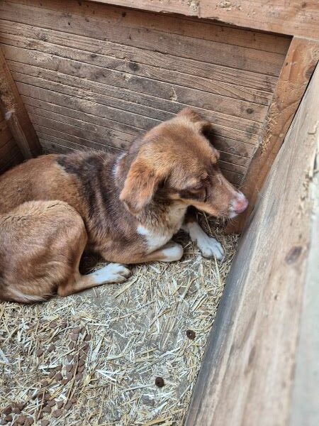 Die hübsche Hündin hielt sich zunächst sehr im Hintergrund als wir den Kennel betraten. Sie schaute sich alles an und war sich nicht sicher, ob sie uns vertrauen konnte. Leckerchen nahm sie vom Boden.. In der Hütte konnten wir sie unter Bedrängung anfassen, sie zeigte keine Abwehr. Geheuer war es ihr nicht, aber wir denken, dass sie in einer anderen Umgebung schnell auftauen würde. Wir vermuten, dass sie bereits Welpen hatte.