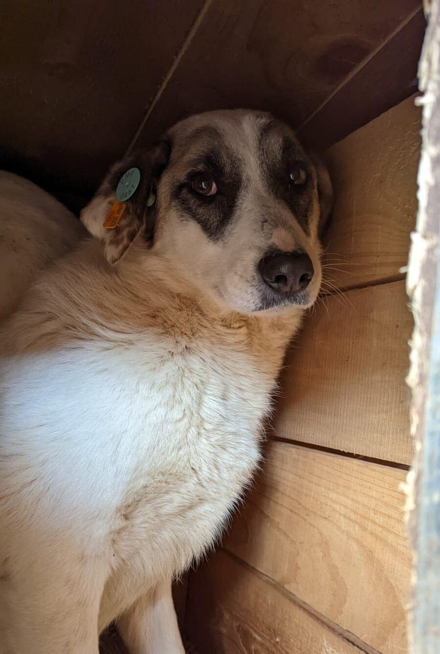 Meistens liegt sie nur in der Hütte, bei Bedrängnis ist sie sehr ängstlich.