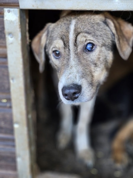 RILEY schaute neugierig aus seiner Hütte, als wir den Kennel betraten. Leider hat er in seiner Kennelgruppe einen schlechten Stand und traute sich deshalb nicht aus seiner Hütte. Als wir RILEY aus der Hütte holten, zeigte er sich freundlich und gerne anfassbar.