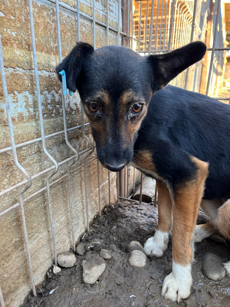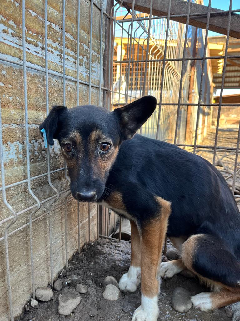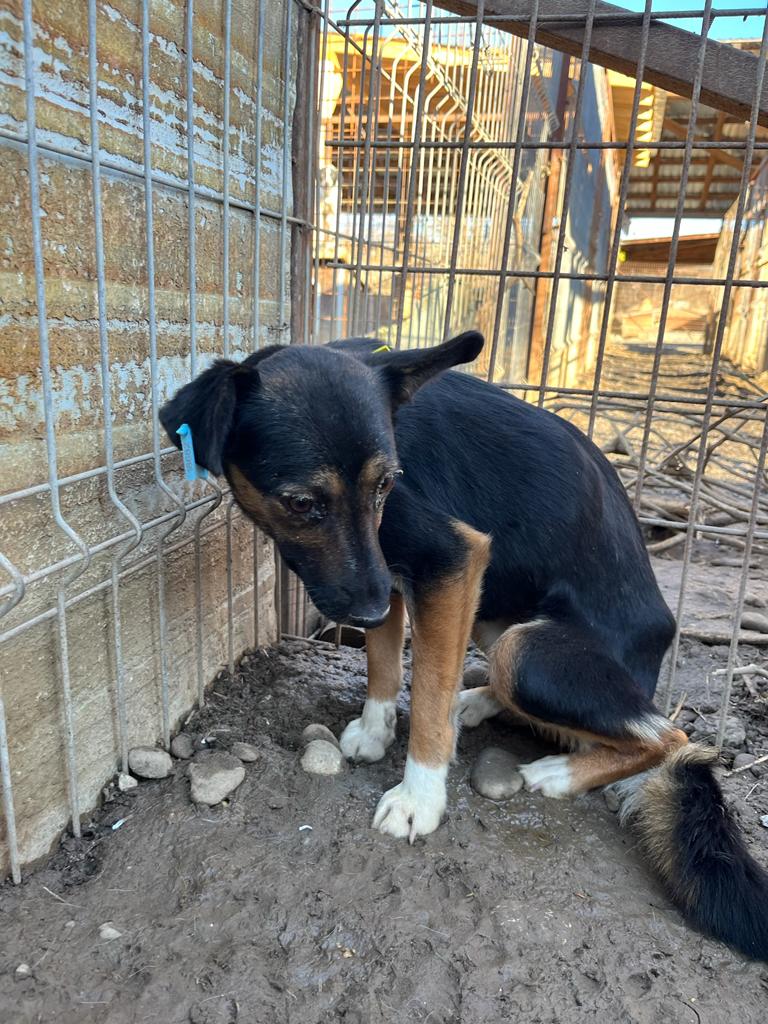 Die arme RINA bietet einen Anblick des Jammers. Die eh schon zart gebaute Hündin ist völlig mager und komplett überfordert mit der Tatsache, plötzlich im Shelter zu sitzen. Sie wich uns beim Näherkommen aus und nahm auch keine Leckerlis. Als wir sie in der Ecke bedrängten, konnten wir sie aber gut anfassen. Sie zeigte dabei kein Abwehrverhalten und ließ es einfach über sich ergehen.