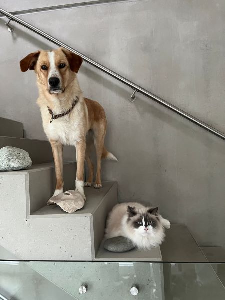 Er ist verträglich mit unseren hundeerfahrenen Katzen, lebt friedlich mit einem weiteren Rüden und einer Hündin zusammen, beherrscht die Hundesprache und ist sehr sozial.