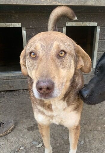 Er lebt in einem sehr kleinen Kennel mit anderen Hunden zusammen, da zeigt er sich sehr verträglich.