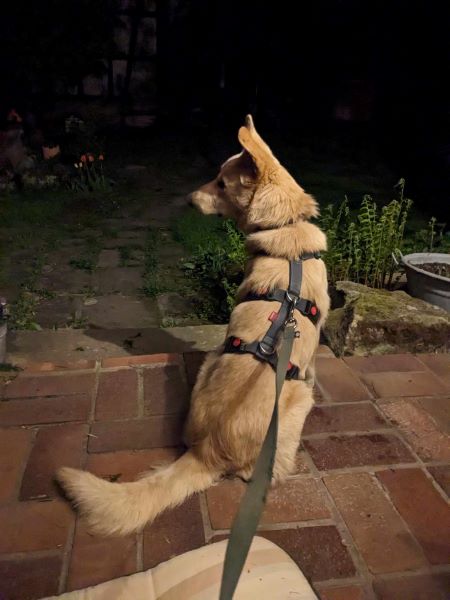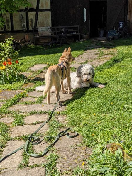 Draußen im Garten oder auch bei Spaziergängen ist er sehr interessiert an seiner Umwelt, ohne dabei zu überdrehen. Er zeigt keinerlei Scheu vor Geräuschen, LKW oder sonstigen Dingen, sondern marschiert selbsbewusst einfach weiter. Er geht vorbildlich an der Leine, kein Ziehen und Zerren, orientiert sich sehr gut am Menschen und an der Ersthündin. Bei Hundebegegnungen ist er aufmerksam und interessiert, geht brav vorbei, egal ob Rüde oder Hündin. Sobald es dunkel wird, passt er im Garten gut auf und meldet kurz, wenn er etwas ungewöhnliches bemerkt.