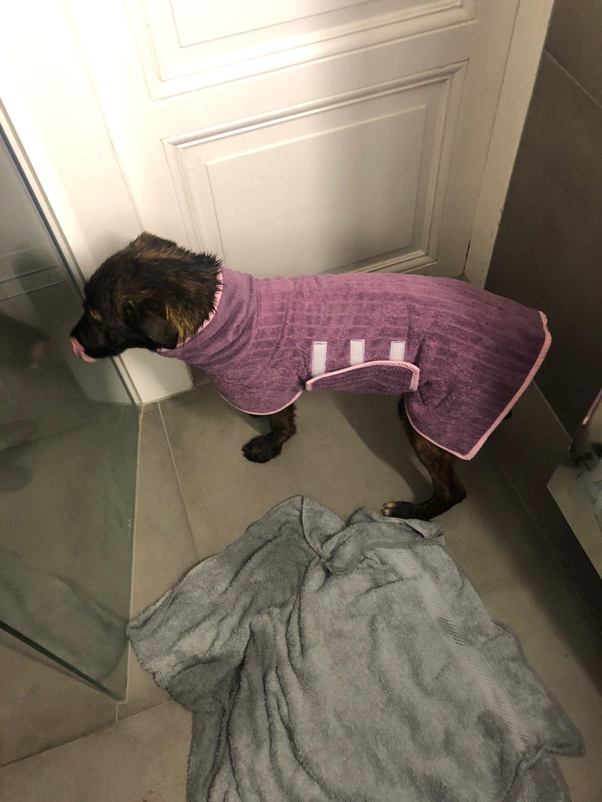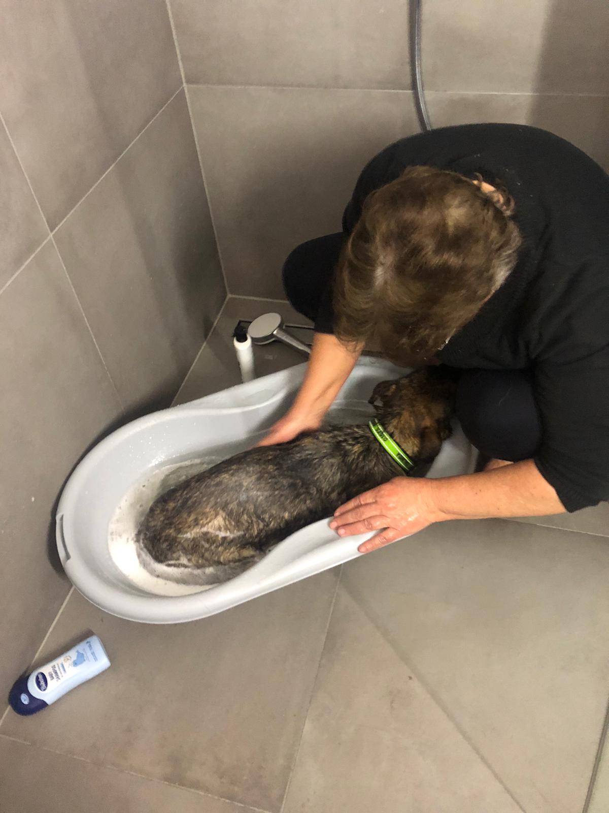 Man mag sich fragen: warum „Löwenherz“? Die Antwort ist ganz einfach: Am 4. März am frühen Abend stieg ein sehr ängstliches Hundemädchen aus dem Trapo. In ihrer Transportbox machte sie sich zunächst unsichtbar. Vor Angst und Sorge musste sie ein paarmal so pupsen, dass wir Abholer dachten, „größeres“ wäre passiert. Aber nein. Beim Herausholen zu Hause waren alle Tücher und Decken sauber und trocken! Roja blieb erstarrt und unsichtbar, ließ sich aber hochnehmen und ins Badezimmer tragen, wo eine Babybadewanne mit angenehm temperiertem Wasser auf sie wartete. Sie entspannte sich und ließ sich shamponieren. Es schien ihr sogar zu gefallen.