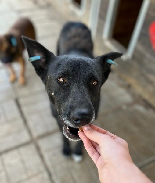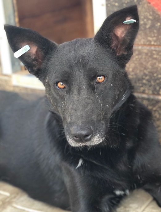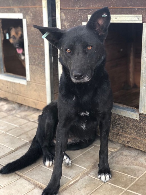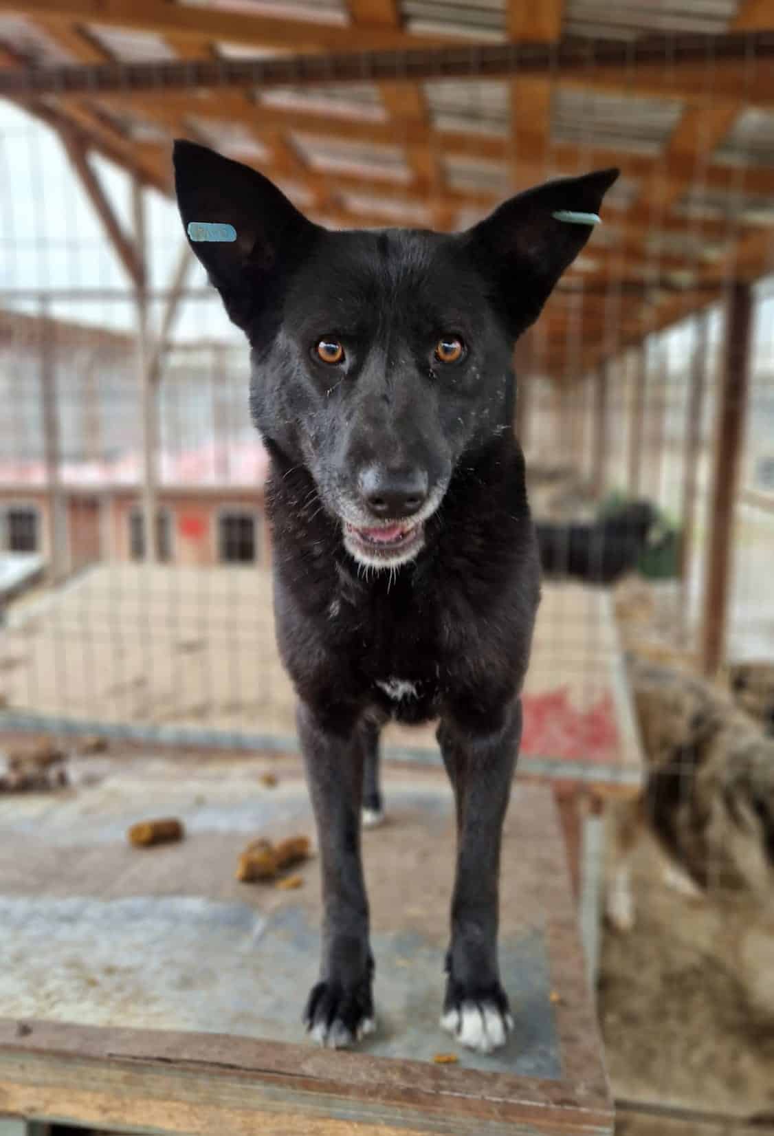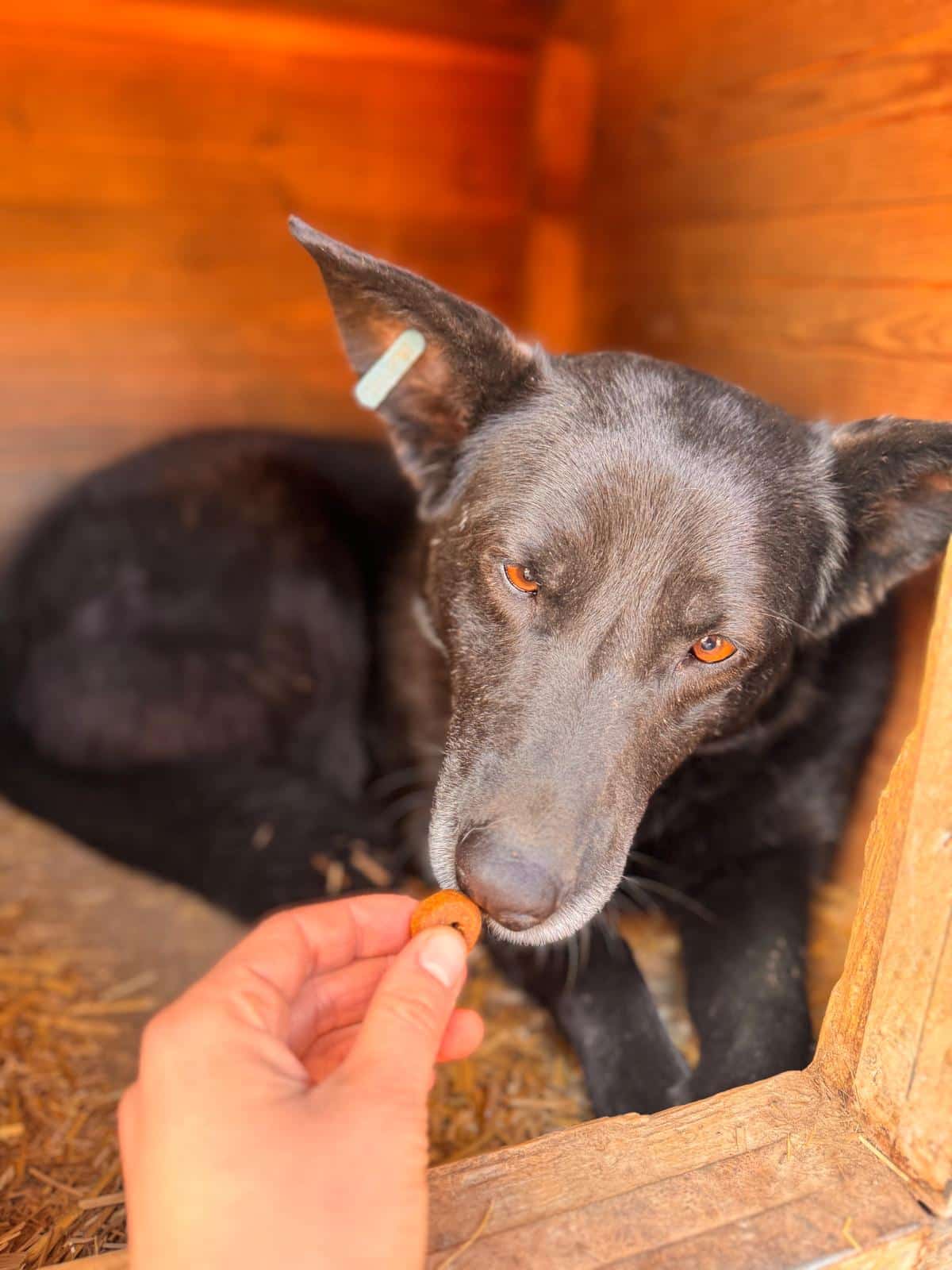 ROMIKA stand sofort interessiert von ihrem Hüttendach auf, als wir den Kennel betraten. Neugierig beobachtete sie das Geschehen und nahm sofort problemlos Leckerlis aus der Hand, als wir uns ihr zuwandten. Trotzdem ist sie weiterhin unsicher und weicht aus, wenn man sie berühren möchte. Auch nach 3 Jahren in Bucov konnten wir sie nicht streicheln.