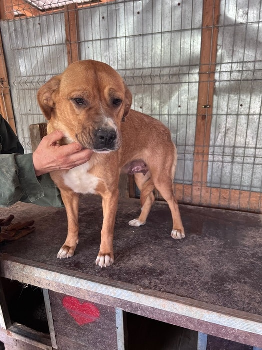 Die nette, zutrauliche Hündin hatte sicher schon Welpen, man sieht es am Gesäuge. Aber was viel wichtiger ist, sie ist sehr freundlich und verträglich. Sie lässt sich prima anfassen und ist sehr interessiert an uns.