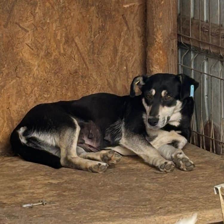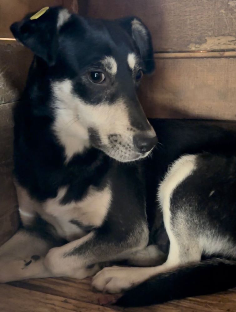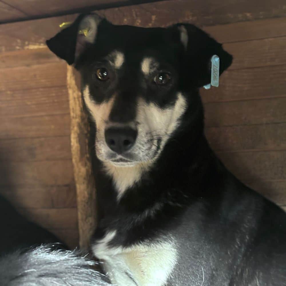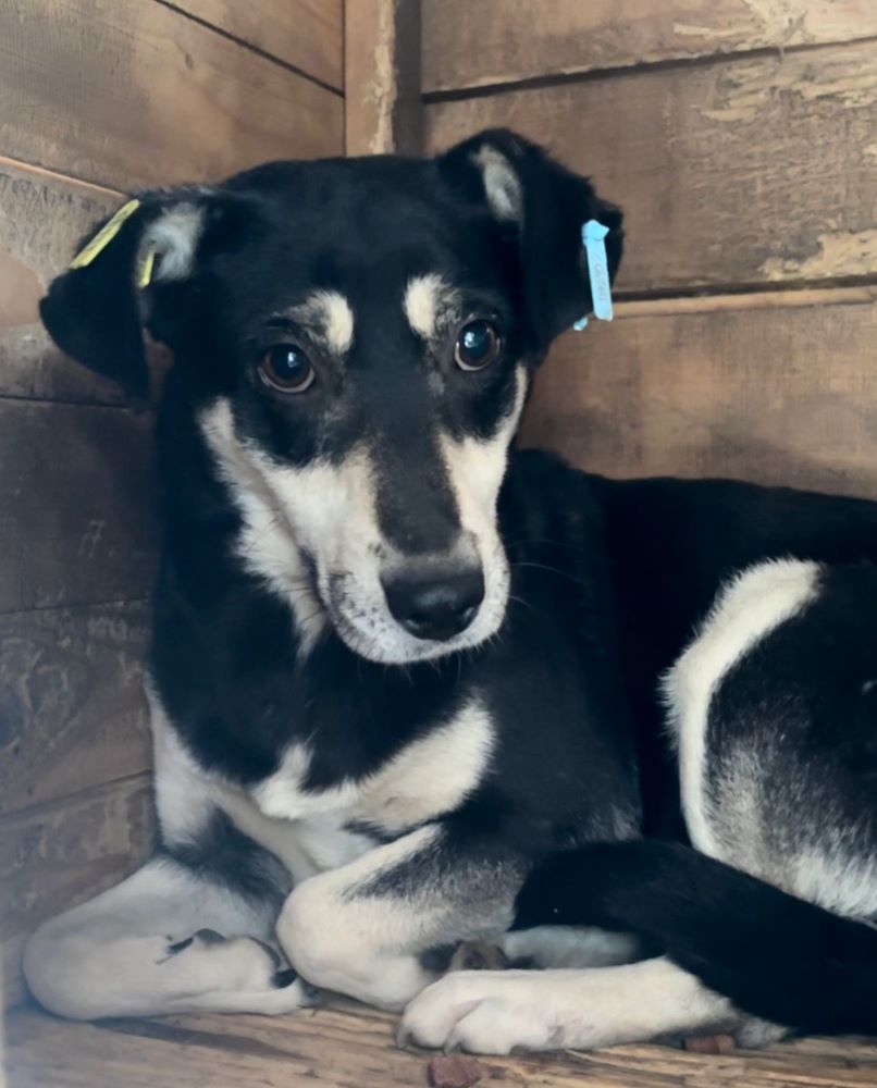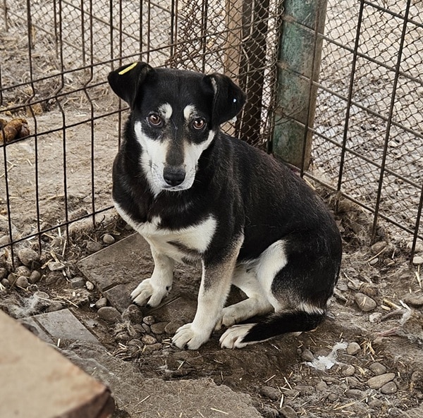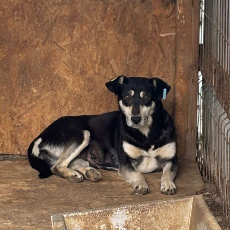 Diese hübsche Hündin hielt sich während unseres Besuchs zunächst gemeinsam mit anderen Hunden in der sicheren Hütte auf und beobachtete das Geschehen. Später konnten wir RONI in der Hütte vorsichtig streicheln – die großen Augen voller Sorge, ob wir es auch wirklich gut mit ihr meinen.