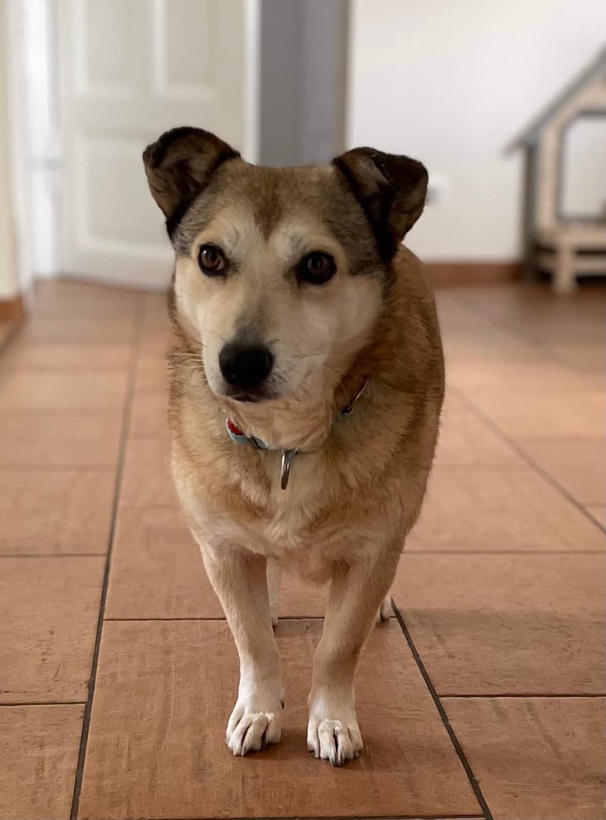 Mittlerweile geht sie spazieren, fährt im Auto mit, bewegt sich frei und ohne Furcht im Haus. Sie ist verträglich mit ihren Artgenossen und auch die Katzen werden akzeptiert. Im Homeoffice liegt sie neben dem Pflegefrauchen und abends ist sie mittendrin im Wohnzimmer. Wir würden Rosa eher als selbstbewusst beschreiben, als vorsichtig, etwas stoisch, charmant und sehr neugierig. Ihr Test auf Mittelmeererkrankungen war negativ, ihre Blutwerte sind super und das Alter ist geschätzt. Es kann sein, dass sie 2 Jahre jünger ist. Vom Temperament ist sie ruhig und genügsam, zwischendurch macht sie vor Freude kleine Sprünge und genießt sichtlich ihre neue Freiheit. Es rührt uns sehr, zu sehen, wie viel Spaß sie mittlerweile hat.