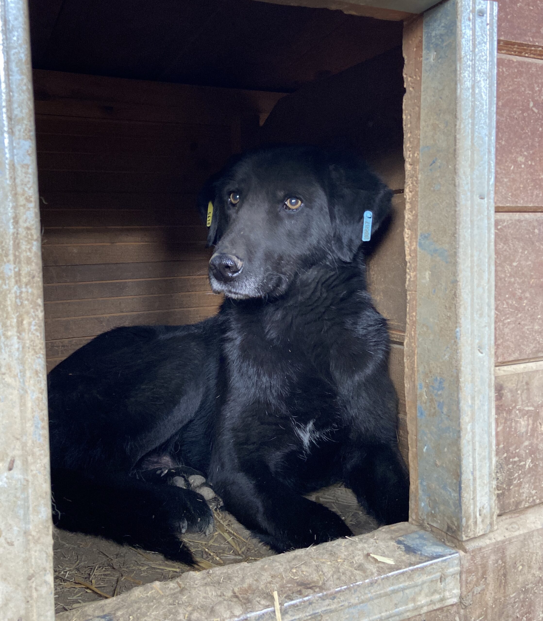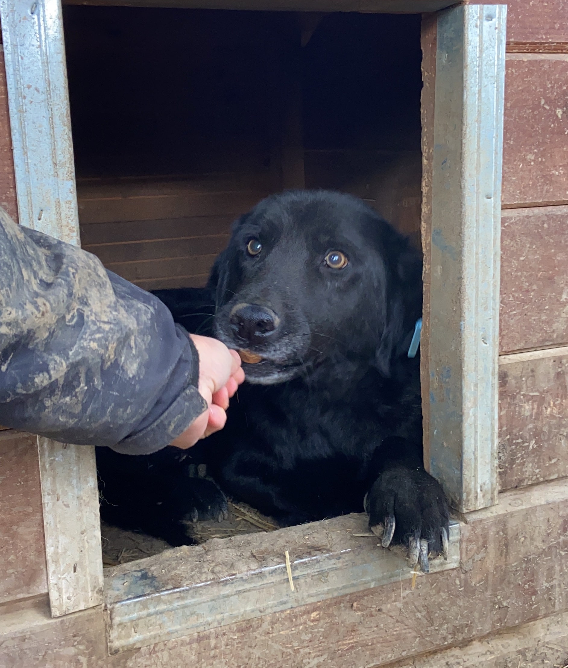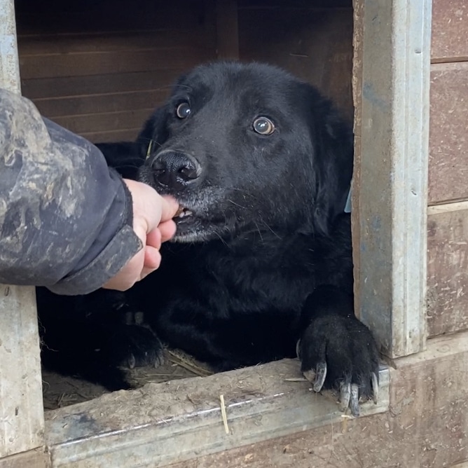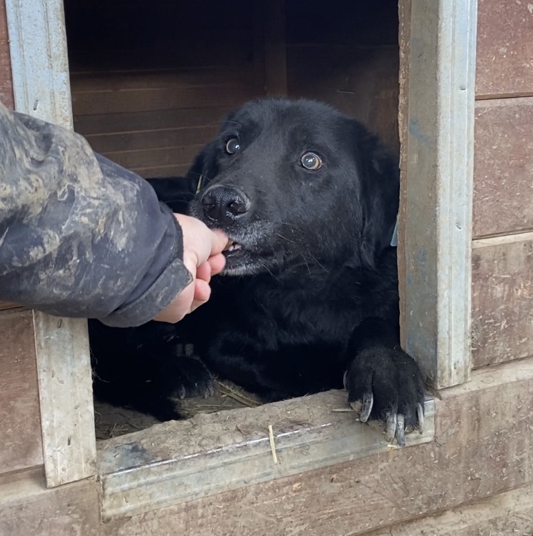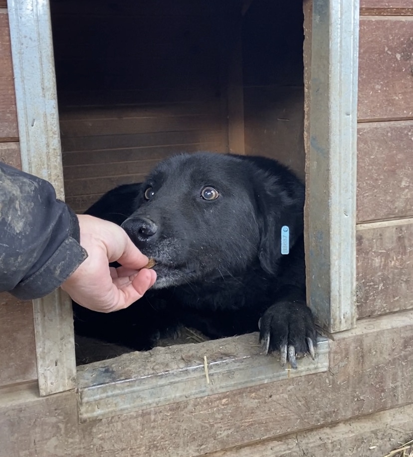 ROUVEN ist leider durch den fehlenden Kontakt weiterhin sehr unsicher im Umgang mit uns Menschen. Hier merkte man deutlich, dass er dies einfach nicht gewöhnt ist. Der nette Rüde blieb während unseres Aufenthaltes die ganze Zeit in der Hütte liegen. An unseren Leckerlis war er jedoch sehr interessiert und nahm diese auch mutig direkt aus der Hand. Anfassen lassen wollte er sich zwar nicht, reagierte aber zu keiner Zeit panisch. Für ROUVEN braucht es Menschen, die geübt sind im Umgang mit unsicheren Hunden und ihm die nötige Zeit und Ruhe zum Ankommen geben, um ihm einen angenehmen Start in ein normales Hundeleben zu ermöglichen.