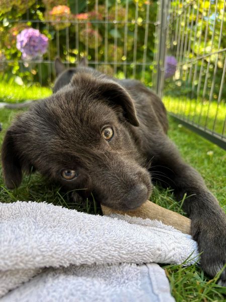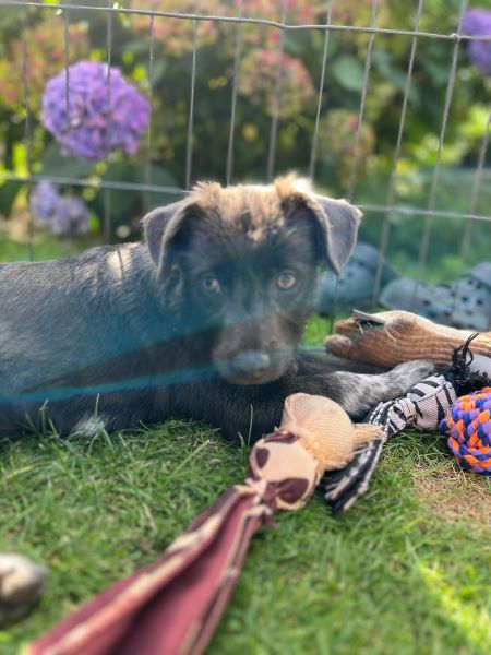 Sie wird gewiss noch ein bisschen wachsen, aber bleibt vermutlich im handlichen Format. Kinder in der Familie sollten unbedingt das Grundschulalter erreicht haben sowie den respektvollen Umgang mit Tieren vermittelt bekommen. Roxana kann schon kurze Autofahrten mitmachen und Minirunden an der Schleppleine gehen. Alles natürlich in moderaten Einheiten. Noch spielt sie gerne viel im Garten mit ihrem kleinen Stoffball oder einem Blatt. Sie beschäftigt sich auch ganz allein mit dem, was ihr die Natur zu bieten hat. Zu unserem gemischten Rudel hält sie aktuell noch respektvollen Abstand aber nähert sich unterwegs an und es kommt schon zu kleinen Tobemomenten!