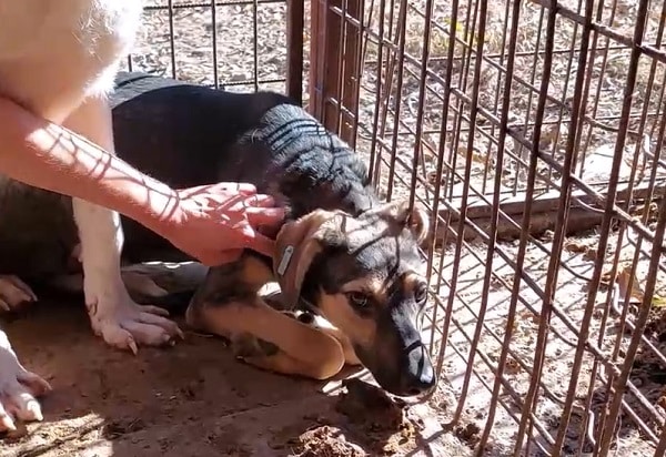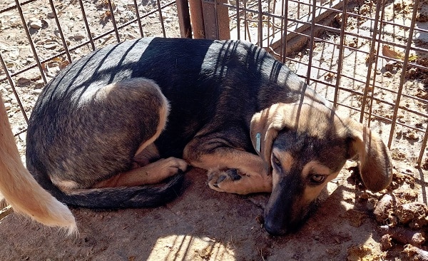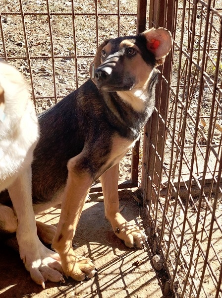 Zu Beginn unseres Besuchs saß die schöne Hündin in der Hütte. Wir konnten sie herauslocken und sie in einer Ecke vorsichtig streicheln. Genießen konnte sie es noch nicht richtig. Sie wird zu ihrem Glück im neuen Zuhause Eingewöhnungszeit und Vertrauensarbeit brauchen.