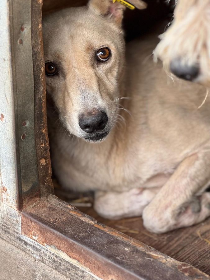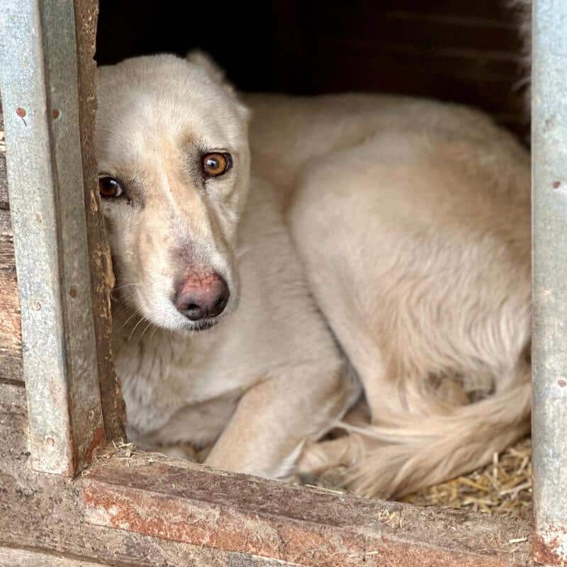 Der süße Rubio traute sich bei unserem Besuch sogar von alleine aus der Hütte. Seine Neugierde hatte gesiegt. Er nahm jedoch noch keine Leckerchen. Ihn zutraulicher zu bekommen, stehen die Chancen bei ausreichender Hundeerfahrung, Zeit und Geduld gut. Er ist zu dem sehr verträglich.
