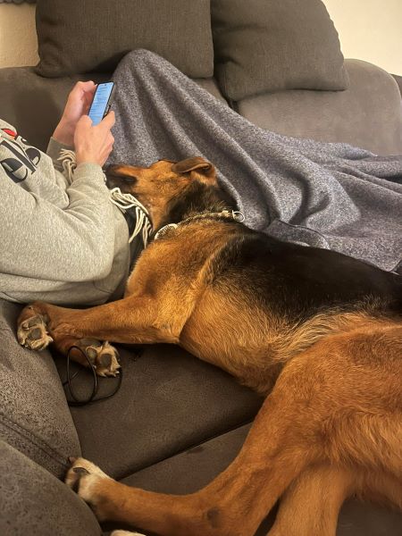 Durch konsequente Zurückweisung beim Verfolgen innerhalb der eigenen vier Wände, fiel ihm auch das Alleine bleiben (in Hundegesellschaft) deutlich einfacher.