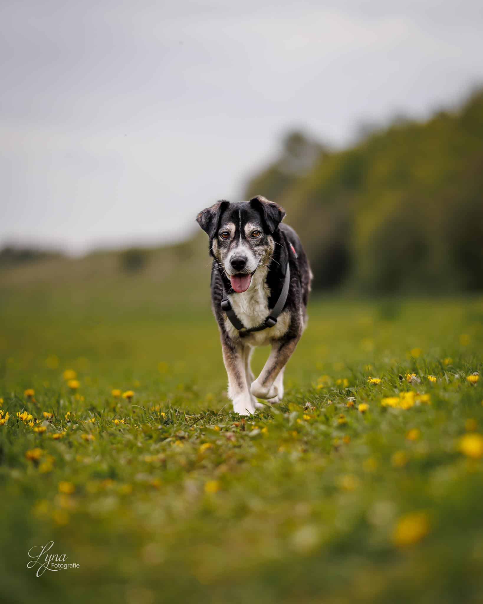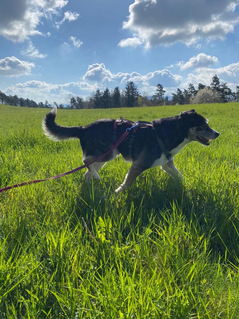 Runa liebt Spaziergänge im Wald oder über die Wiese, dort dreht sie ihre Kreise und genießt das Leben.