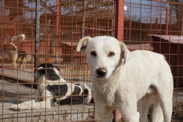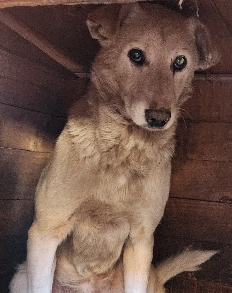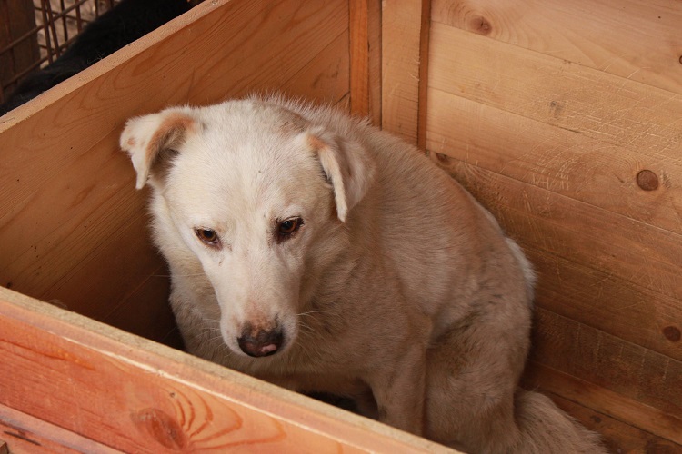 RUNNER saß in seiner Hütte, als wir den Kennel betraten. Er wollte weder die angebotenen Leckerchen vom Boden annehmen, noch näheren Kontakt zu uns.