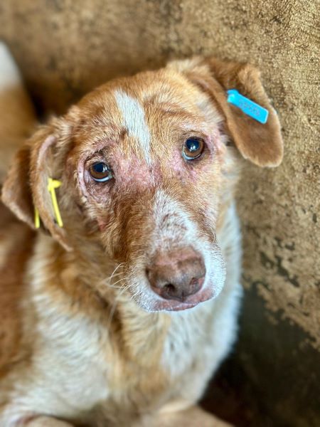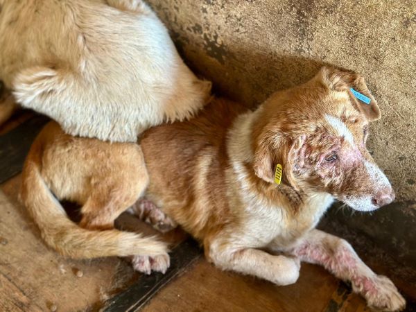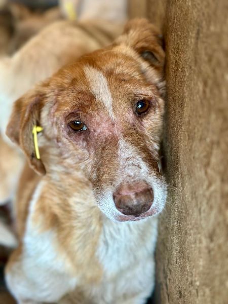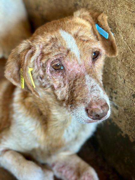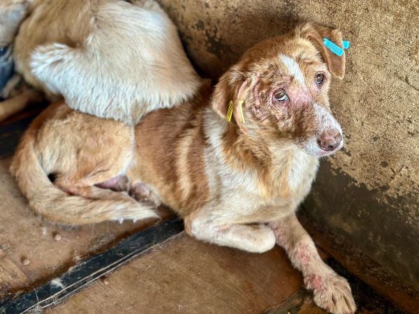 Zusammen gekauert zwischen vielen anderen Hunden liegt dieser hautkranke Rüde. Er wirkt müde, resigniert und möchte nur noch schlafen. Noch recht jung und schon so vom harten Leben gezeichnet. Die nächste Zeit wird für ihn nicht einfacher werden, vielleicht sogar die Schwerste in seinem Leben. Wir konnten ihn überall anfassen, er ließ alles über sich ergehen, aber genießen konnte er es nicht. Konnte er schon einmal etwas genießen? Wir wissen es nicht. Er kann gut zu anderen Hunden, denn er wirkt verträglich in seiner Resignation.