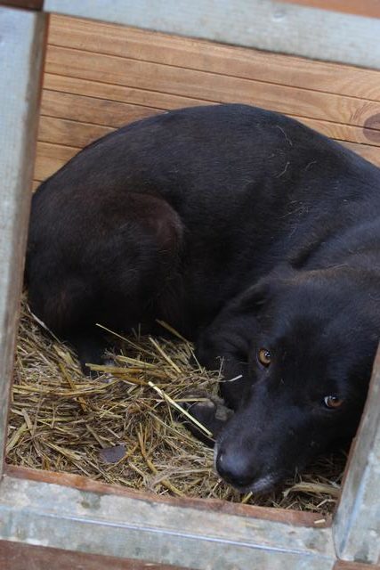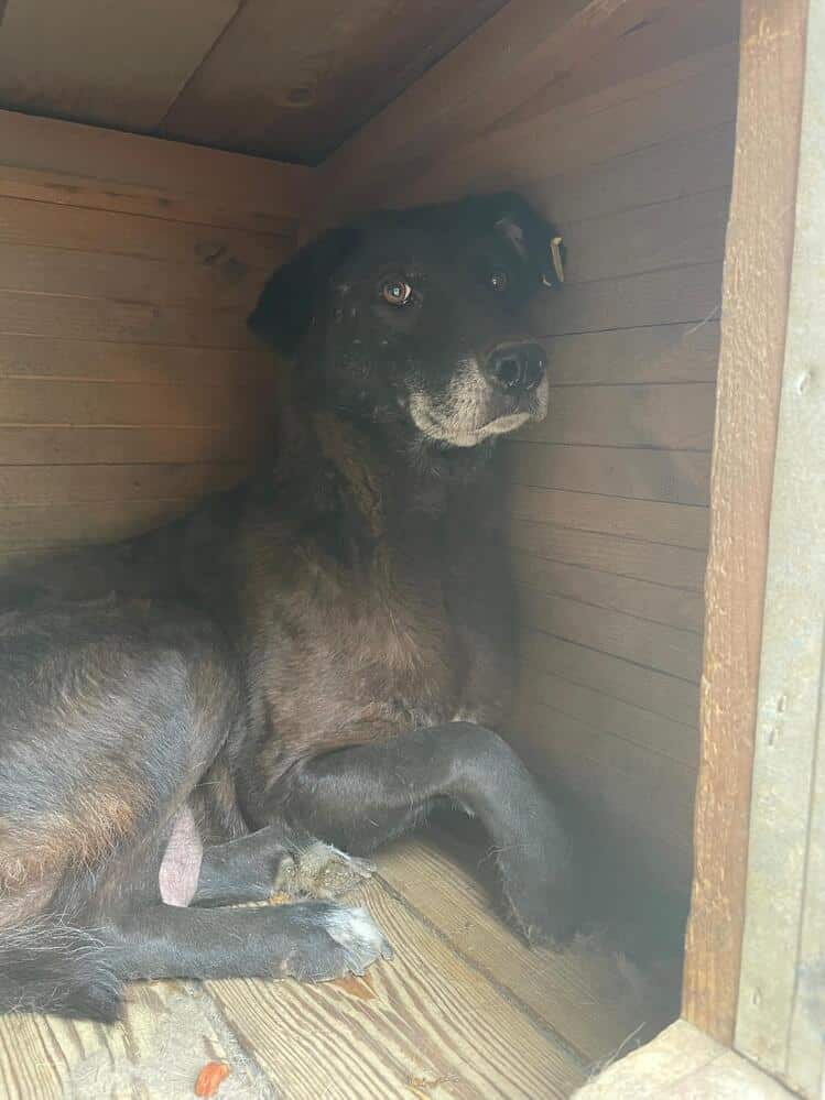 SADDY ist eine unsichere Hündin, die in ihrer Hütte lag und nicht herauskam. Wir vermuten, dass sie mal Welpen hatte. Sie ließ leichte Berührungen zu und nahm auch Leckerlies aus der Hand.