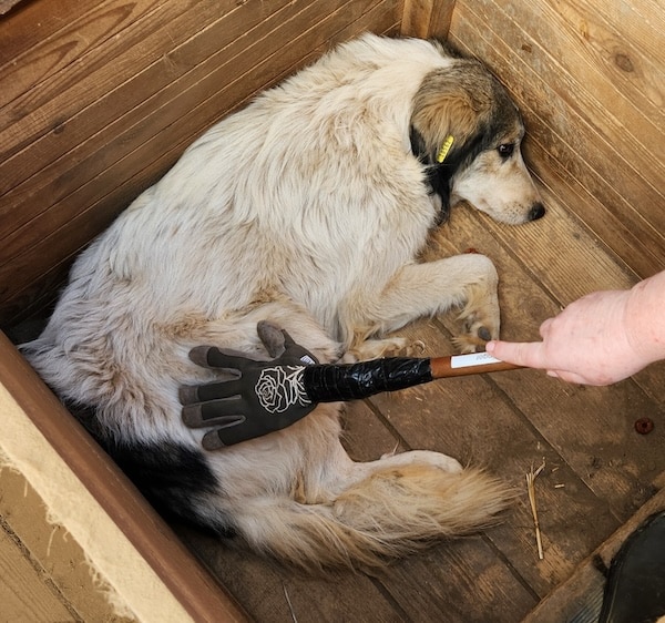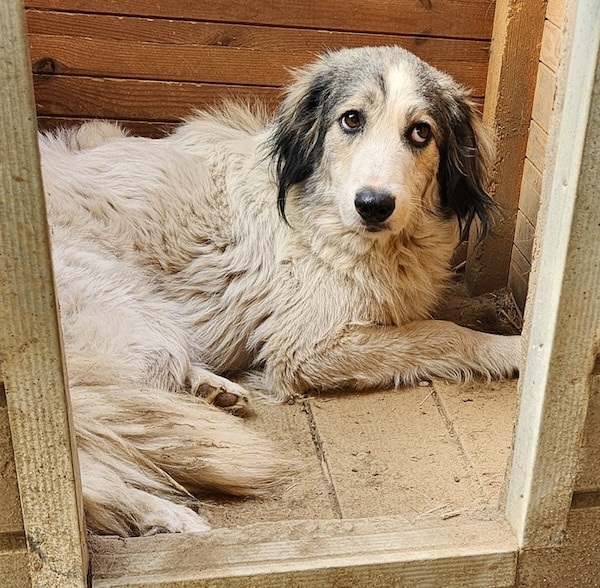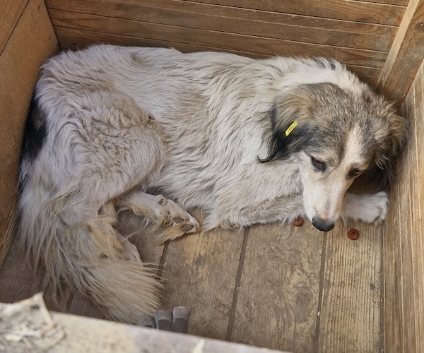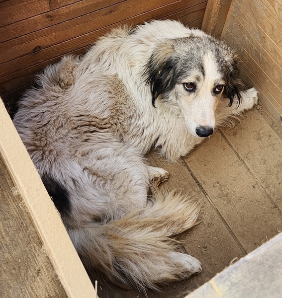 Die zarte SAIDA blickte uns mit sorgenvollen Augen an und suchte Schutz in der Hütte, wo sie sich gut streicheln ließ. Auch wenn sie es noch nicht so recht genießen konnte, blieb sie zu jeder Zeit defensiv. Die angebotenen Leckerchen wollte SAIDA lieber noch nicht annehmen. Mit etwas Zeit und Geduld, in einem ruhigen Umfeld mit einem Zweithund, an dem sie sich orientieren kann, würde die schöne SAIDA aber sicherlich Vertrauen zum Menschen fassen und sich weiter öffnen.
