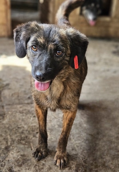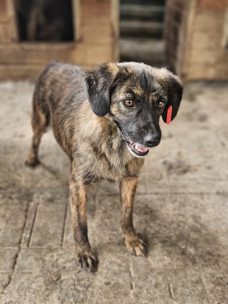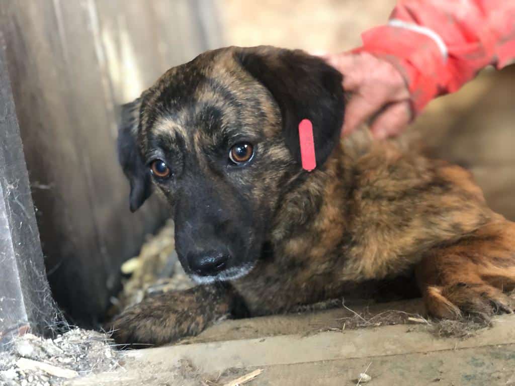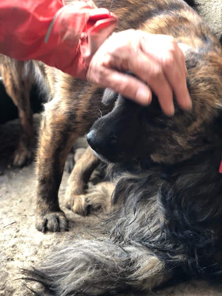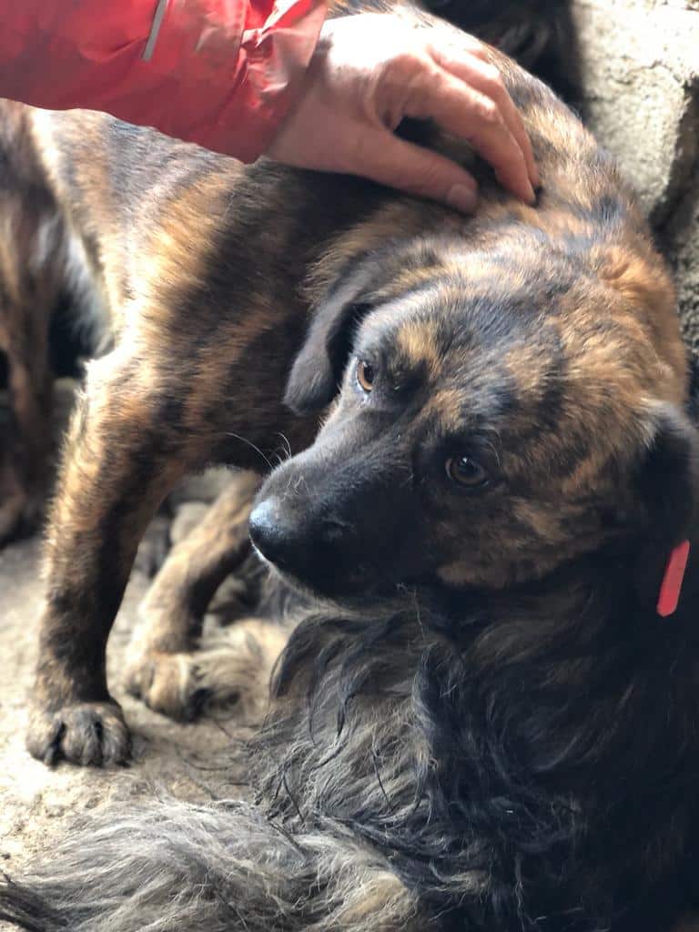 Die kleine, gestromte Hündin schaute uns mit großen verängstigten Augen an. Obwohl SAKURA so große Angst vor uns hatte, ließ sie unsere Streicheleinheiten ohne jegliche Abschnappversuche zu. Auf den Arm haben wir sie nicht nehmen können, da wir keine Verfolgungsjagd im Kennel veranstalten wollten. Aber auch außerhalb der Hütte haben wir sie kurz gestreichelt, bevor sie wieder flüchtete. Wir suchen Menschen mit viel Hundeerfahrung, die der kleinen Dame behutsam Stück für Stück die Angst nehmen können. Souveräne Zweithunde könnten ihr helfen. Verträglich ist sie sehr.