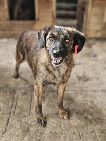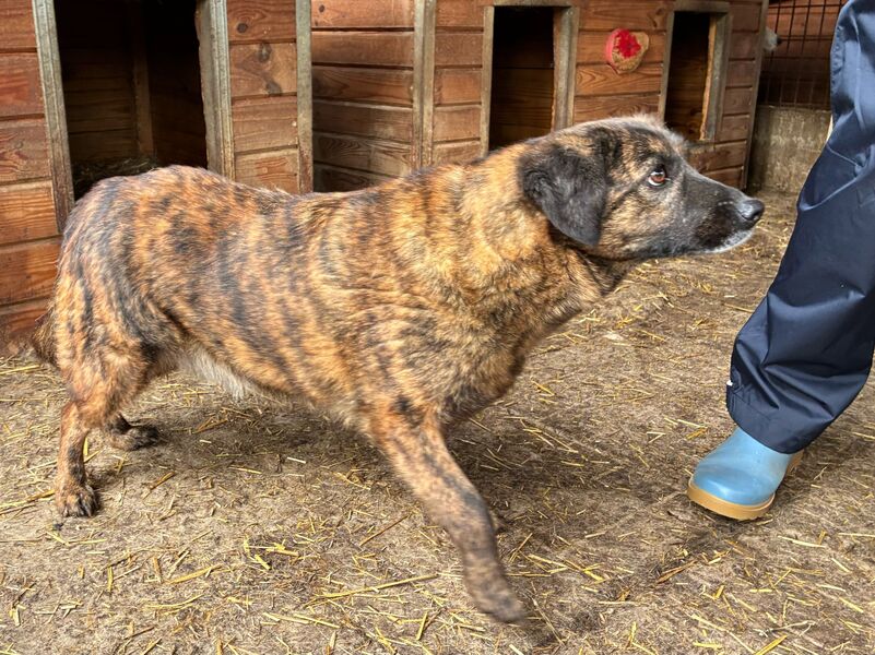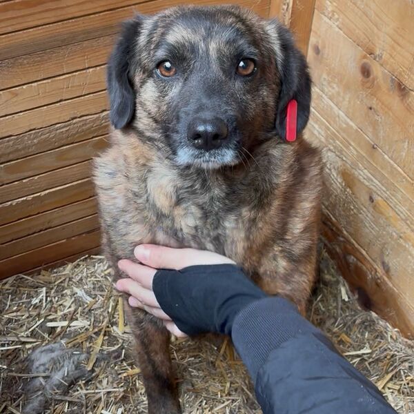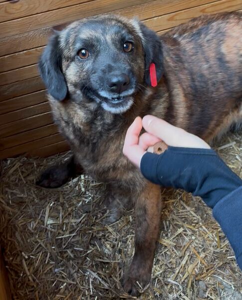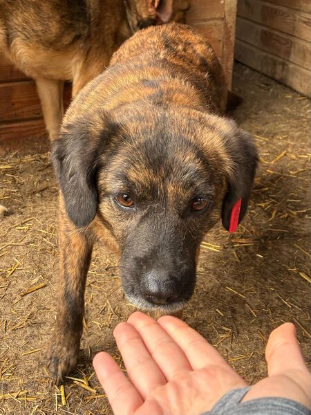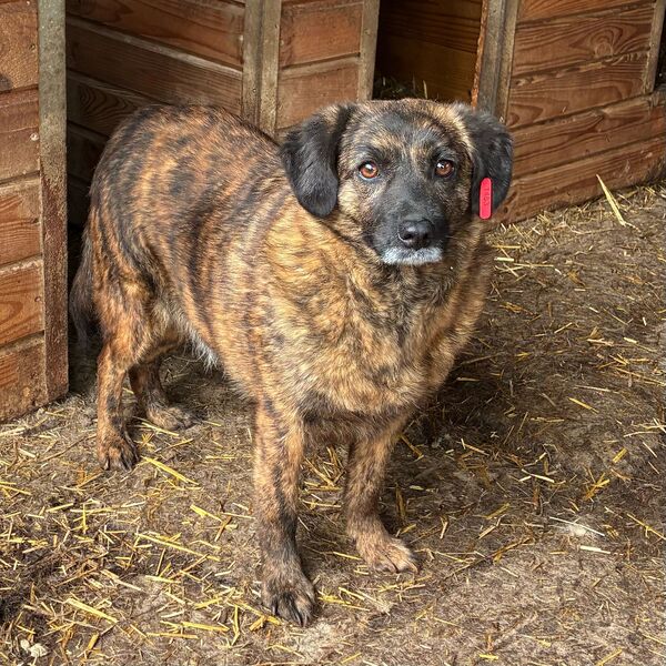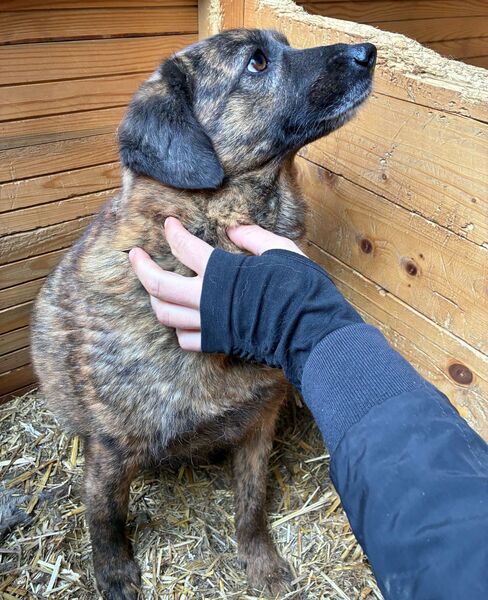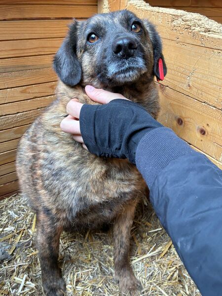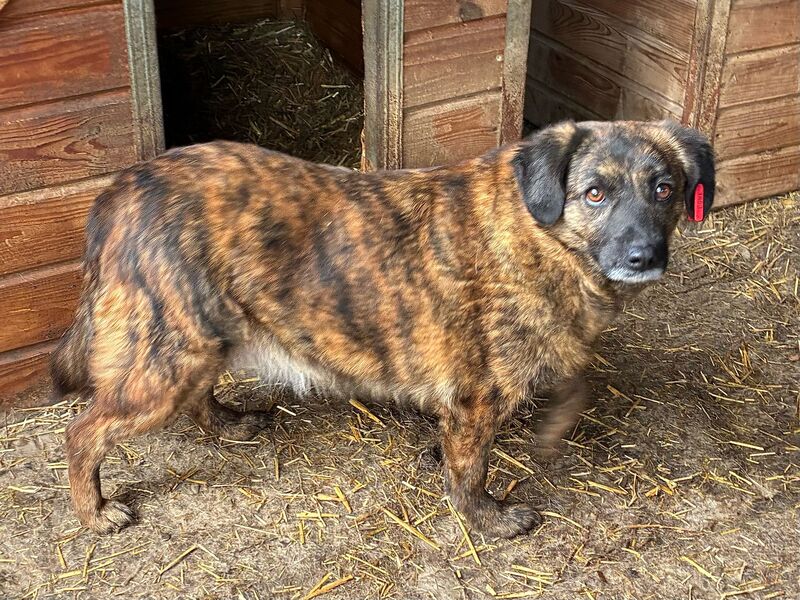 Unsere zuckersüße SAKURA mit der tollen gestromten Fellzeichnung zeigte sich bei unserem Besuch von der ersten Sekunde sehr neugierig. Sie ist die Kleinste in ihrem Rudel und hat aktuell durch den Bewegungsmangel etwas zu viel auf den Rippen. Im offenen Kennel kommt sie gern bis zur Hand und holt sich Leckerlie, weicht weiteren Annäherungsversuchen jedoch aus. In der Hütte konnten wir sie schließlich problemlos streicheln, nur genießen konnte sie diese Zuwendung noch nicht so recht. SAKURA ist diese intensive Nähe vermutlich einfach nicht gewohnt. Wir sind uns sicher, dass sie in einer stressfreien Umgebung bei erfahrenen und einfühlsamen Menschen rasch Fortschritte machen und Vertrauen fassen wird. Ihre Futtermotivation ist eine tolle Trainingsbasis. Von einem netten Ersthund an ihrer Seite würde die verträgliche Maus sicher profitieren. Wir wünschen ihr diese Chance sehr.