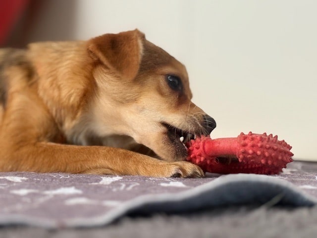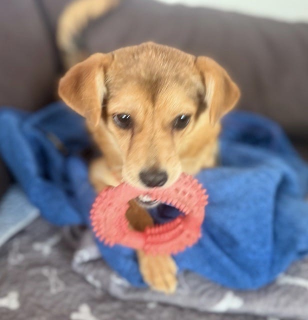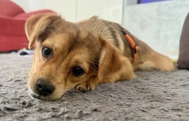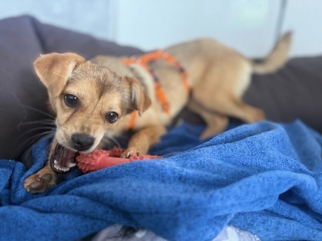 Sie liebt ihre Box und genießt es dort immer mal wieder zur Ruhe zu finden. Sie ist ein sehr entspannter Junghund.