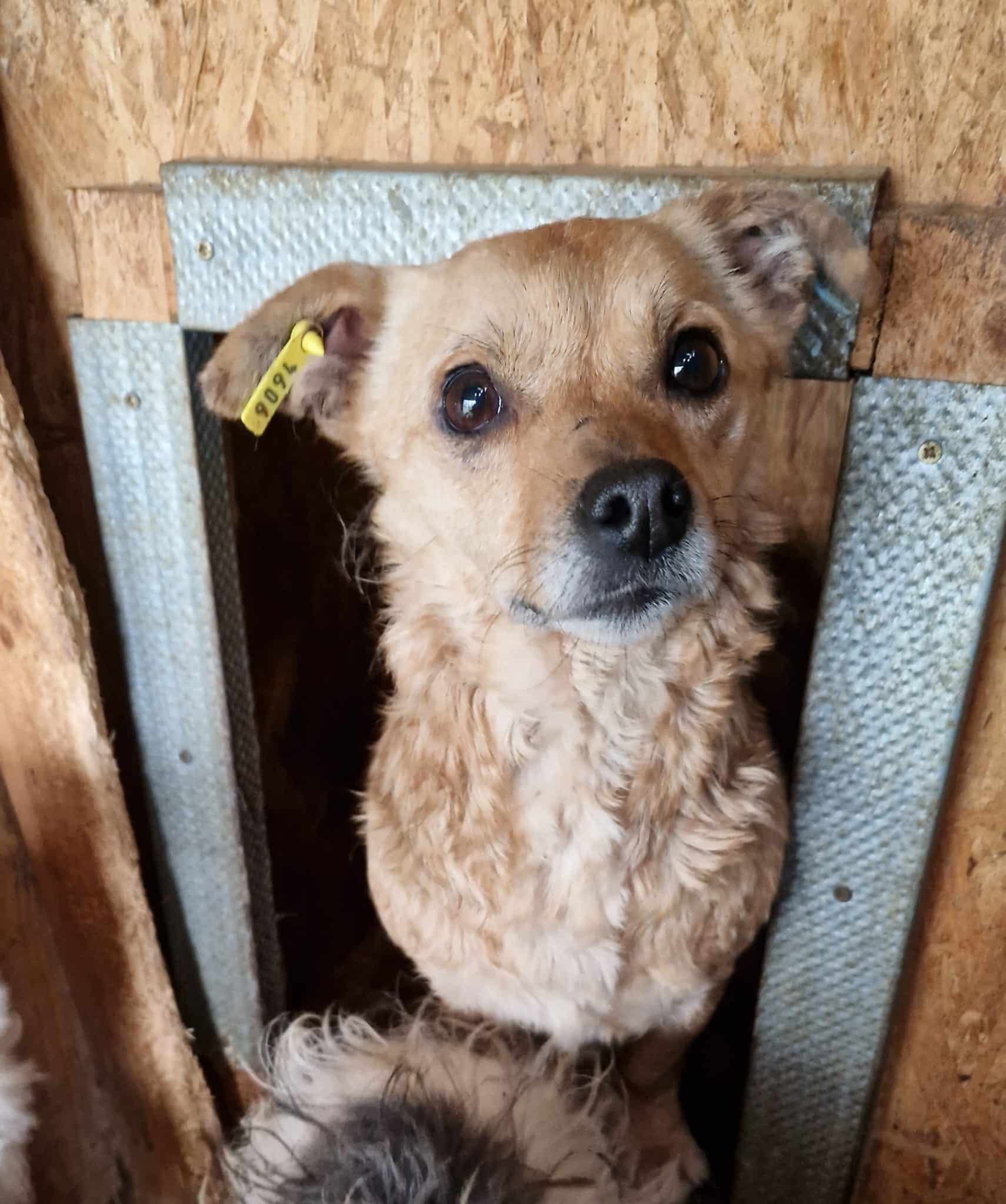 eine freundliche kleine Hündin, die sehr traurig wirkt