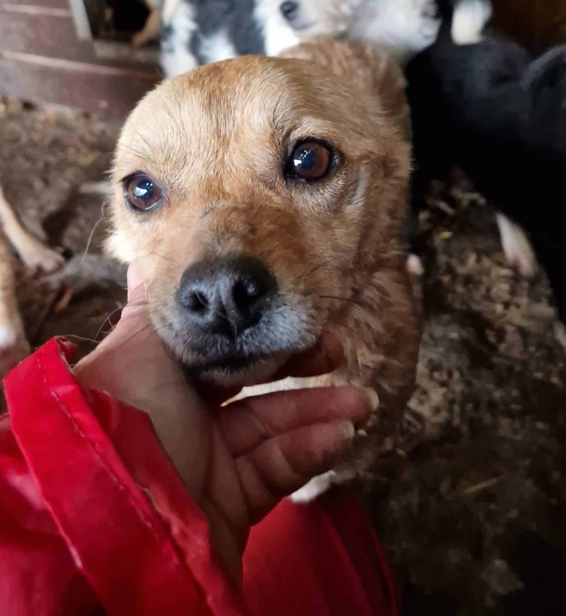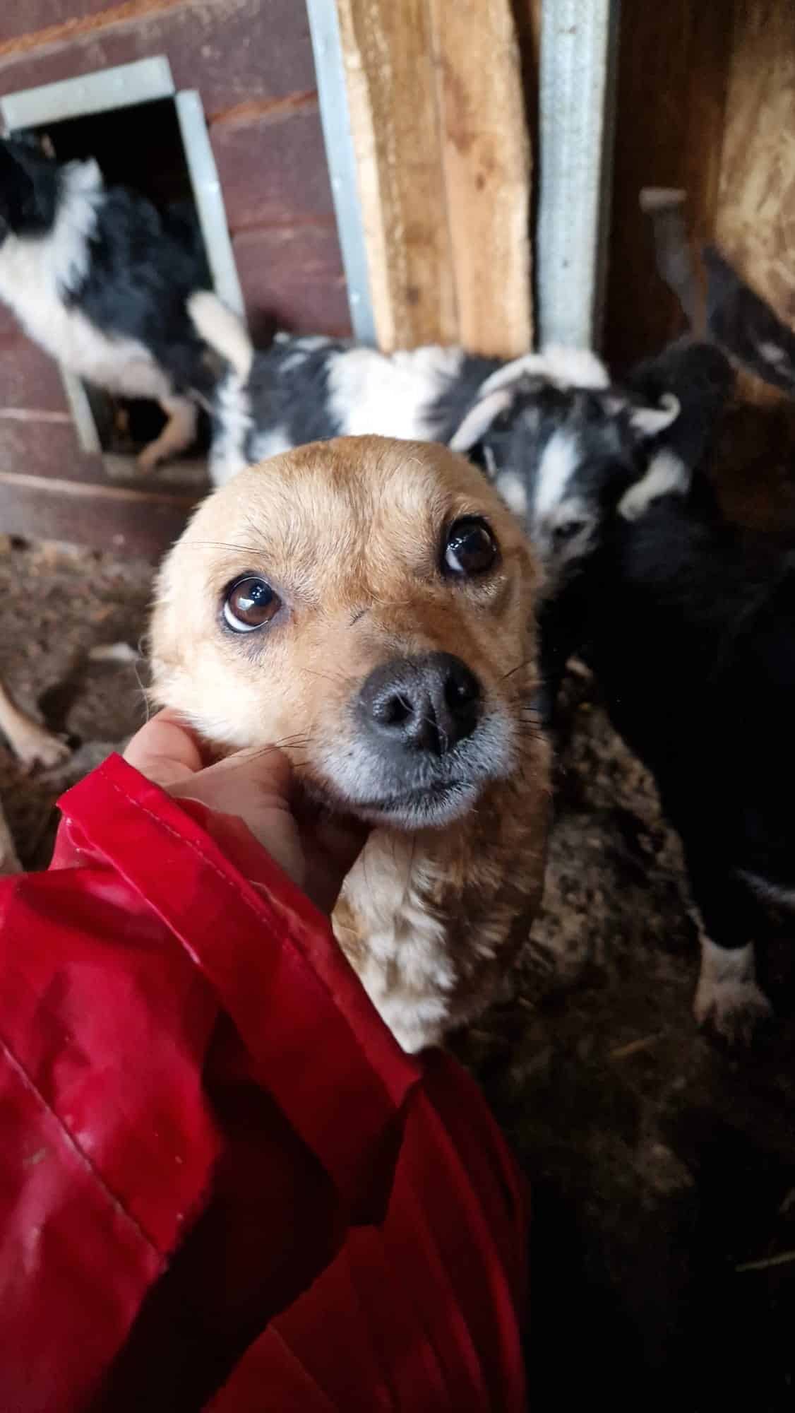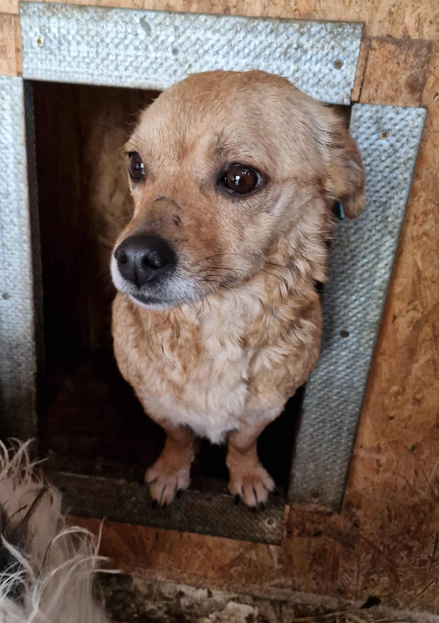 sitzt in einem sehr vollen Kennel mit Welpen und erwachsenen Hunden, der Trubel ist der liebevollen Hündin zuviel, deshalb sitzt sie den ganzen Tag in der Hütte
