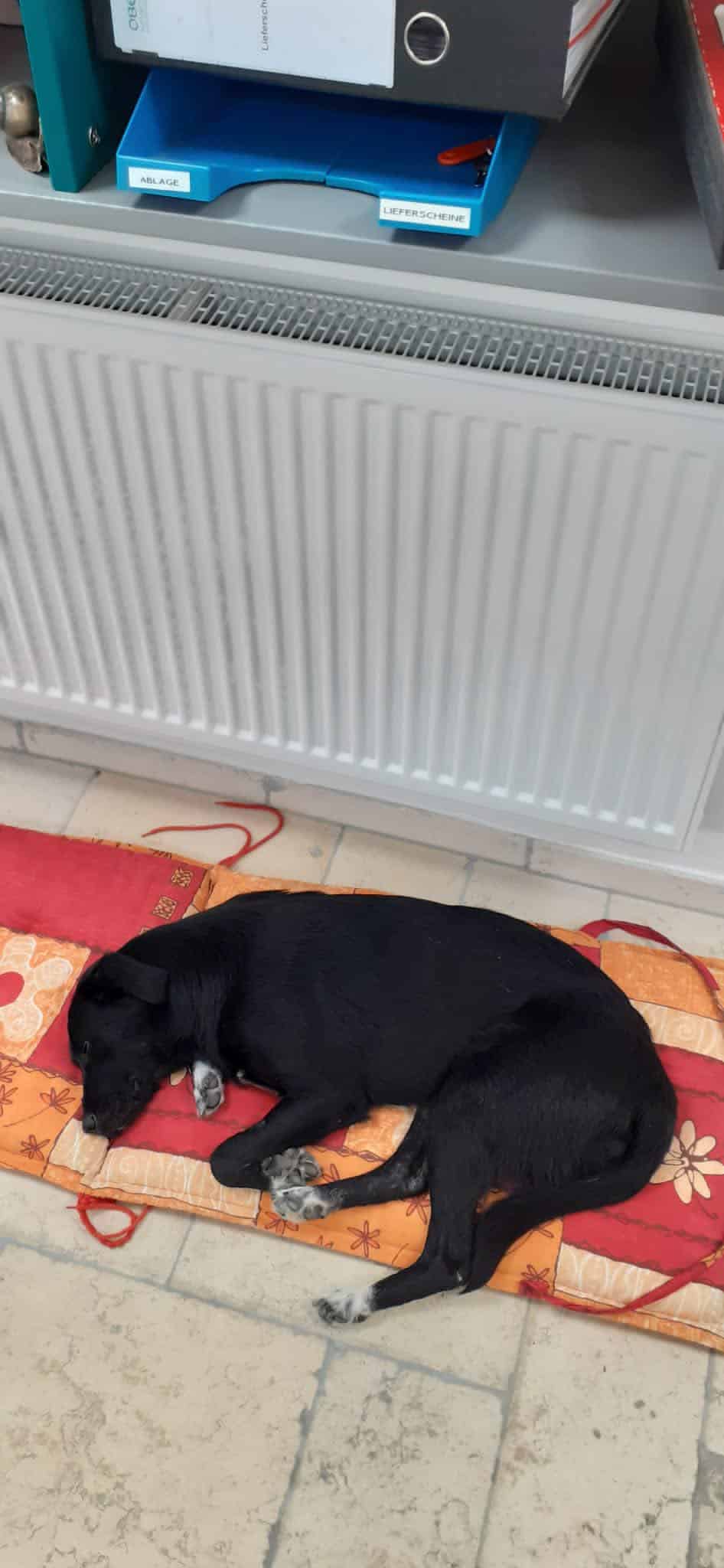 Sie ist halbtags mit mir und drei weiteren Hunden auf der Arbeit im Büro. Sie mag gerne Autofahren und kann 1-2 Stunden alleine bleiben. Längere Zeit müsste noch geübt werden.