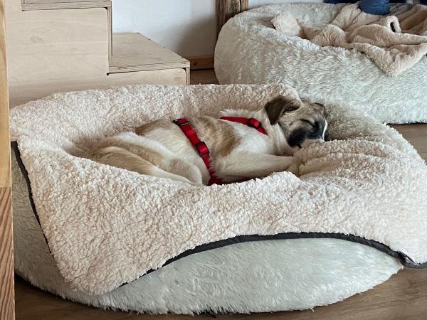 Die kleine Samantha ist seit Mitte Dezember 2023 bei uns als Pflegehund in einem Rudel von 3 Hunden.
