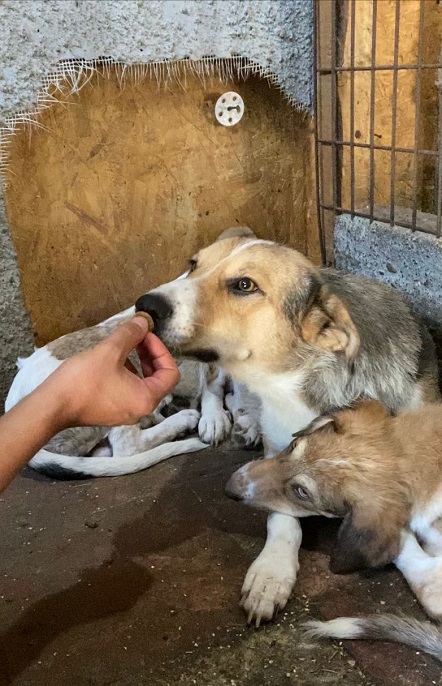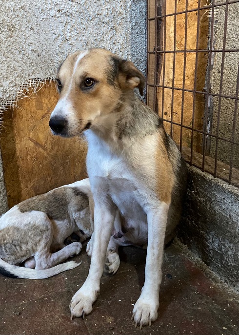 Derzeit sitzt sie mit ihren Welpen und anderen Junghunden im Shelter und geht sehr liebevoll mit allen um.