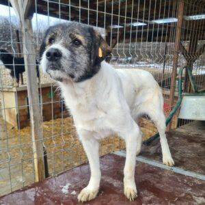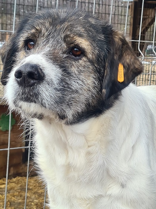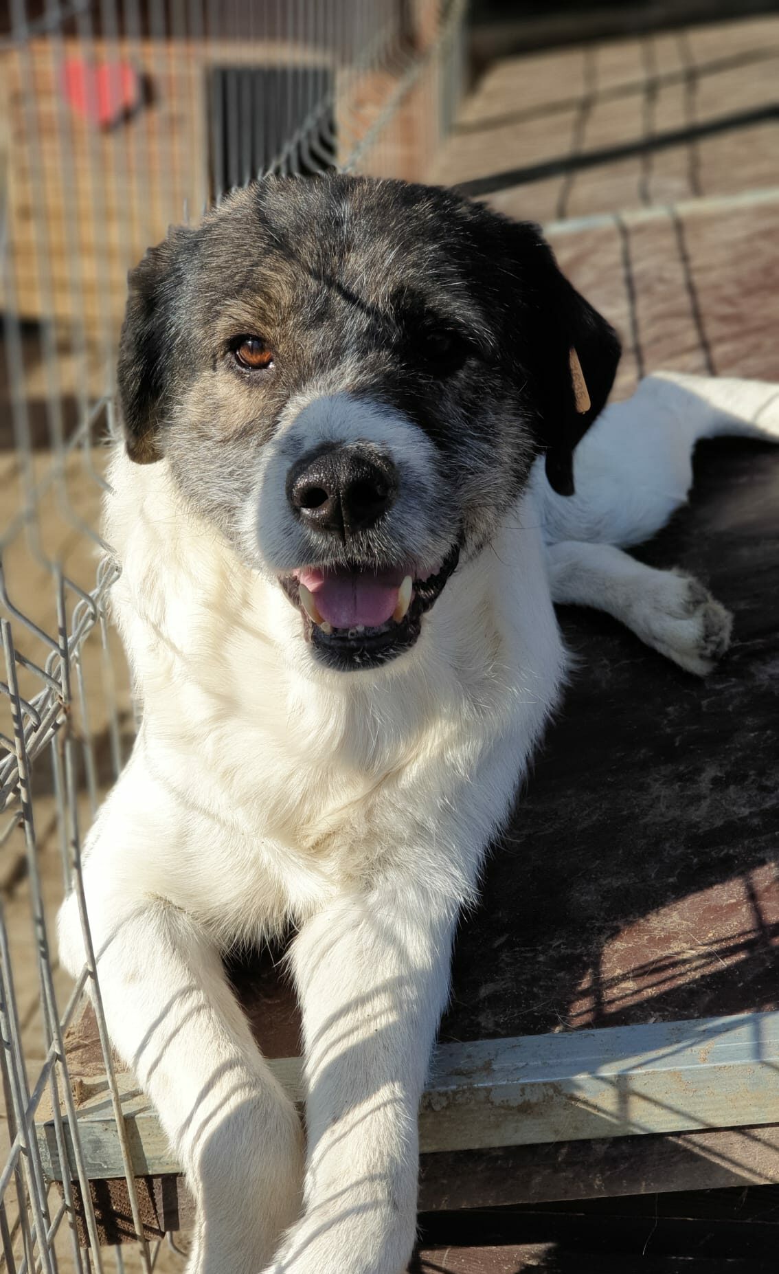 SAMO lag während unseres Besuchs in seinem Kennel auf einem Hüttendach. Er macht einen souveränen und auch altersbedingt ruhigen Eindruck auf uns und beobachte erst einmal das Geschehen. Unsere Leckerlis nahm er gerne aus der Hand und ließ sich auch am Kopf streicheln.