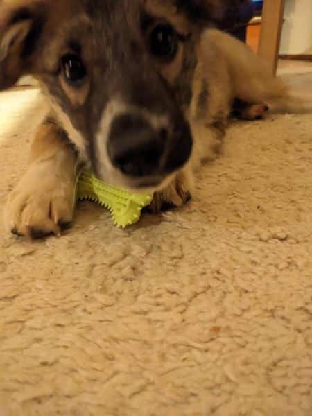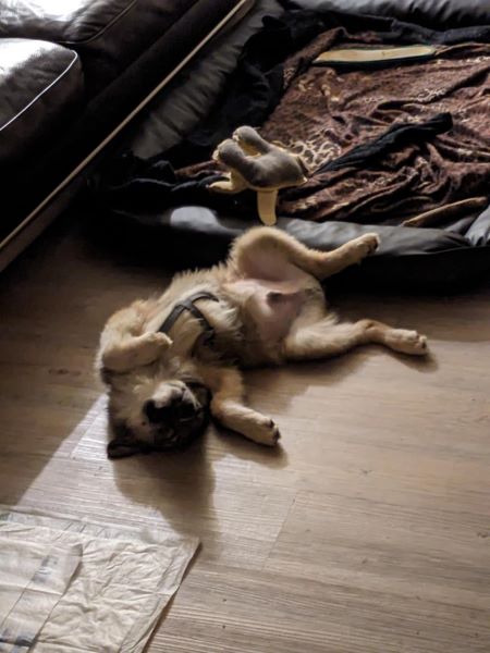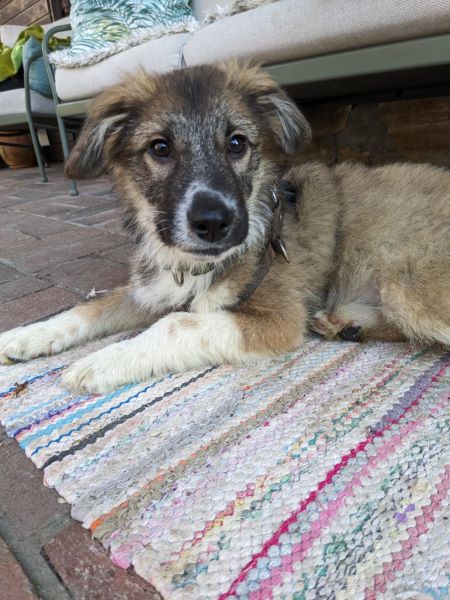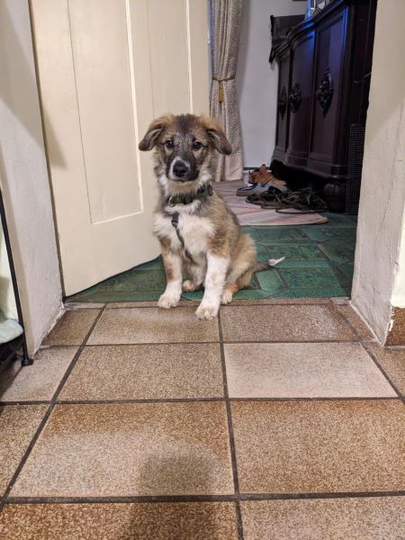 Er verschleppt gerne alles was man so nicht aufgeräumt hat in sein Körbchen und da sollte man schon schnell sein. Filzpantoffeln findet er total klasse. An der Leine laufen ist natürlich noch ausbaufähig, die Stubenreinheit klappt schon sehr gut. Er meldet sich so gut wir immer, wenn er mal raus muss und man muss seine Zeiten beachten. Das Alleine bleiben über kurze Zeiten wird gerade geübt, wir verlängern langsam die Zeitspanne. Er kennt schon seinen Namen und das Wort „Nein“. Erste Regeln wie Küchenverbot (Katzenfutter) werden gut angenommen, auch Sitz funktioniert schon. Er ist ein kluges Kerlchen.
