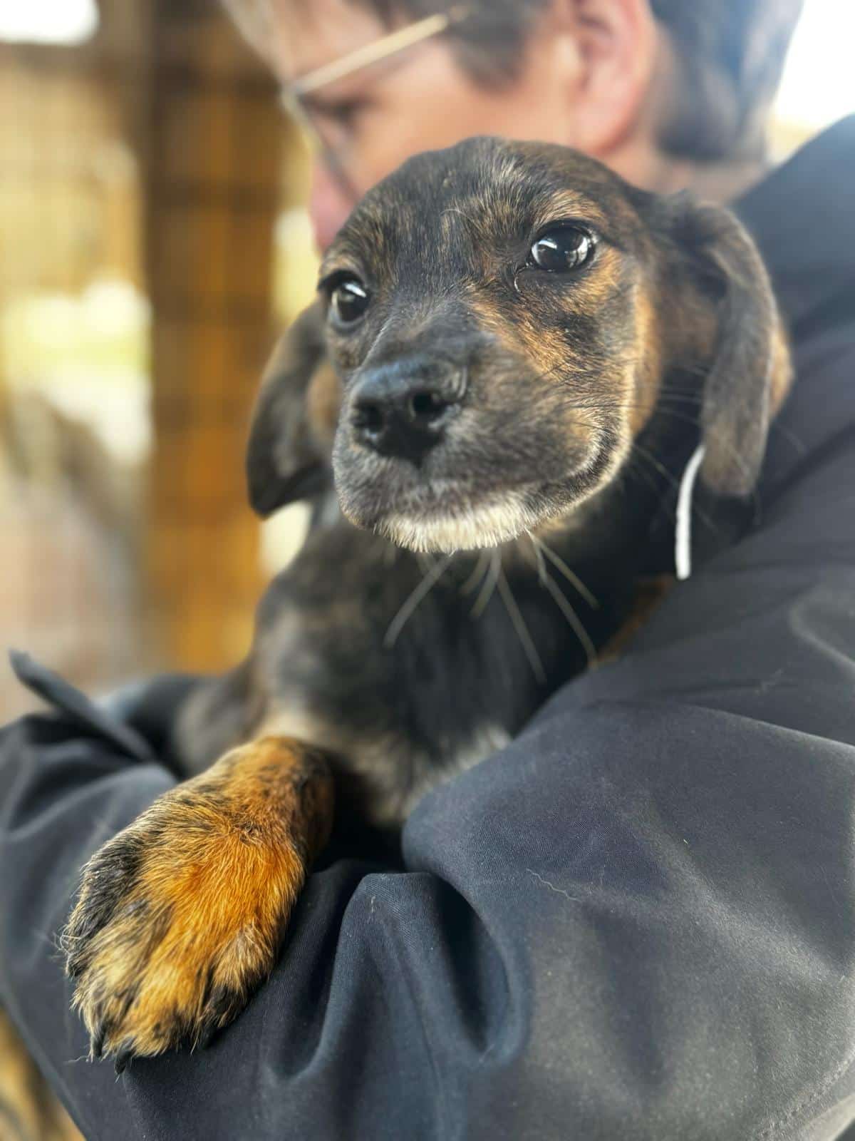 Die sehr kleine und sehr dünne SANNA haben wir in einem vollkommen überfüllten Welpenkennel gefunden. Dort muss die kleine Maus mit 15 weiteren Hunden, hauptsächlich Welpen, ums Überleben kämpfen. Da sie – zusammen mit ebenfalls-Notfall Becky – mit Abstand die Kleinste im Kennel ist, muss sie besonders viel aushalten und das sieht man der kleinen Hündin auch an. Sie ist absolut zu dünn und zudem auch vollkommen überfordert. Sie kommt nur sehr schwer ans Futter und wird von den anderen Welpen einfach über den Haufen gerannt. Damit sie nicht vollkommen unter die Räder kommt, zieht sie sich meist hinter die Hütten zurück und verpasst somit die meisten Fütterungszeiten.