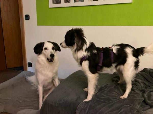 Zu Beginn war er sehr ängstlich und man musste förmlich „Fangen“ mit ihm „spielen“ um ihm sein Geschirr anzuziehen (Hier hat uns die Hausleine geholfen). Mittlerweile ist er bei mir schon sehr zutraulich, freut sich, wenn wir „Adda“ rufen, was bei uns bedeutet, dass es nun rausgeht zum Spaziergang und er lässt sich von mir auch problemlos das Geschirr anziehen. Bei meinem Partner ist er noch zurückhaltend, aber wir merken auch hier jeden Tag kleine Fortschritte, da er inzwischen bereits neben ihm auf der Couch liegt und sich streicheln lässt. Bei meinem Partner sieht man, dass Santosch mit viel Liebe und Geduld auch bei einem Mann in kleinen Schritten auftaut.
