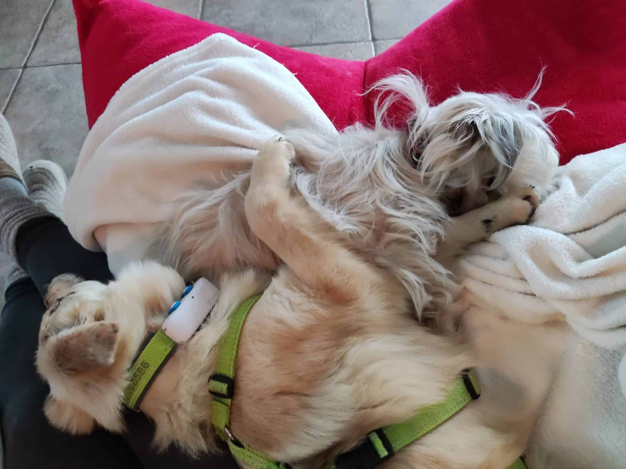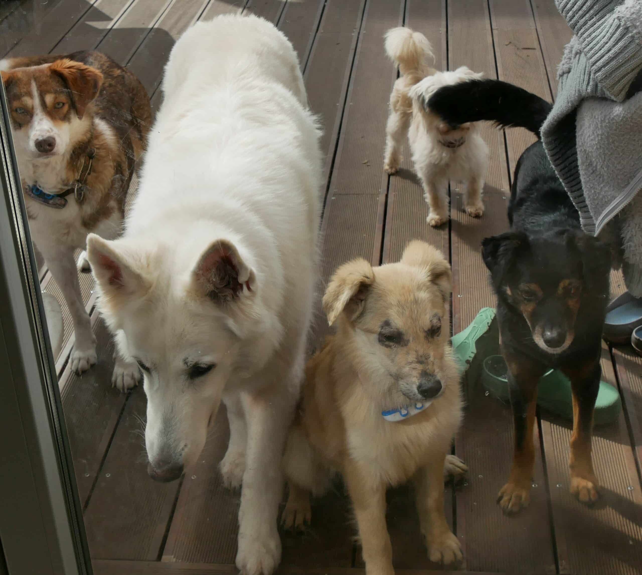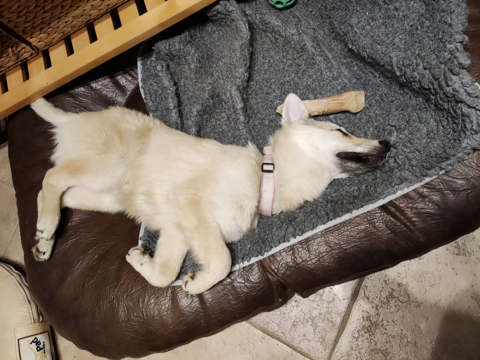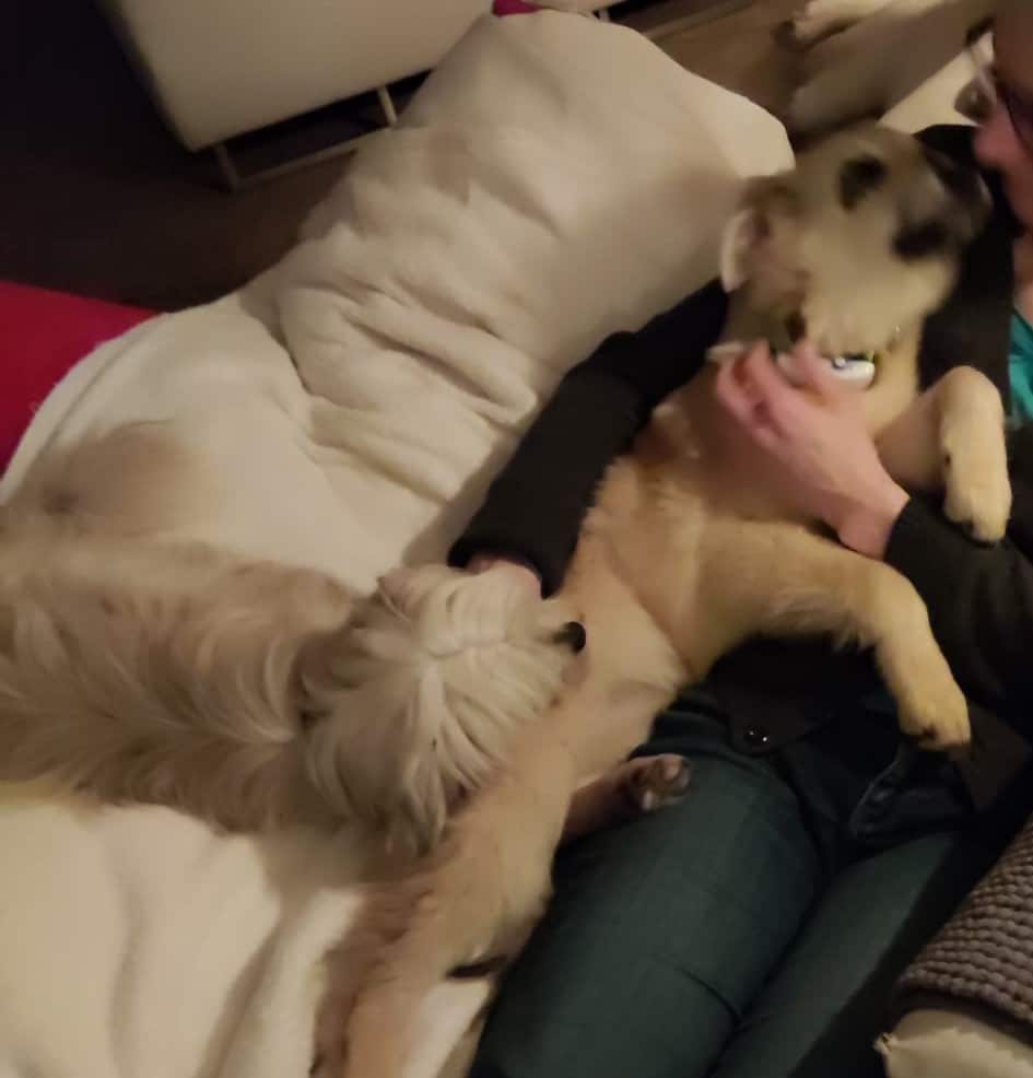 An der Stubenreinheit arbeiten wir noch; wenn man aufmerksam und schnell ist, kann man ihre Zeichen bald sicher deuten. Generell ist sie eher ein ruhiger Hund, kann jedoch auch bellen. Gerade wenn unbekanntes auf sie zukommt, wird es kommentiert. Auch das wird jedoch im Laufe ihrer Horizonterweiterung sicherlich weniger. Mit den Katzen kommt sie ebenfalls klar; von der Seniorkatze gab es schon ein paar an die Backen – nun macht Sarna respektvoll einen Bogen. Mit den jüngeren Katzen kaspert sie schon mal rum oder lässt sie einfach links liegen.