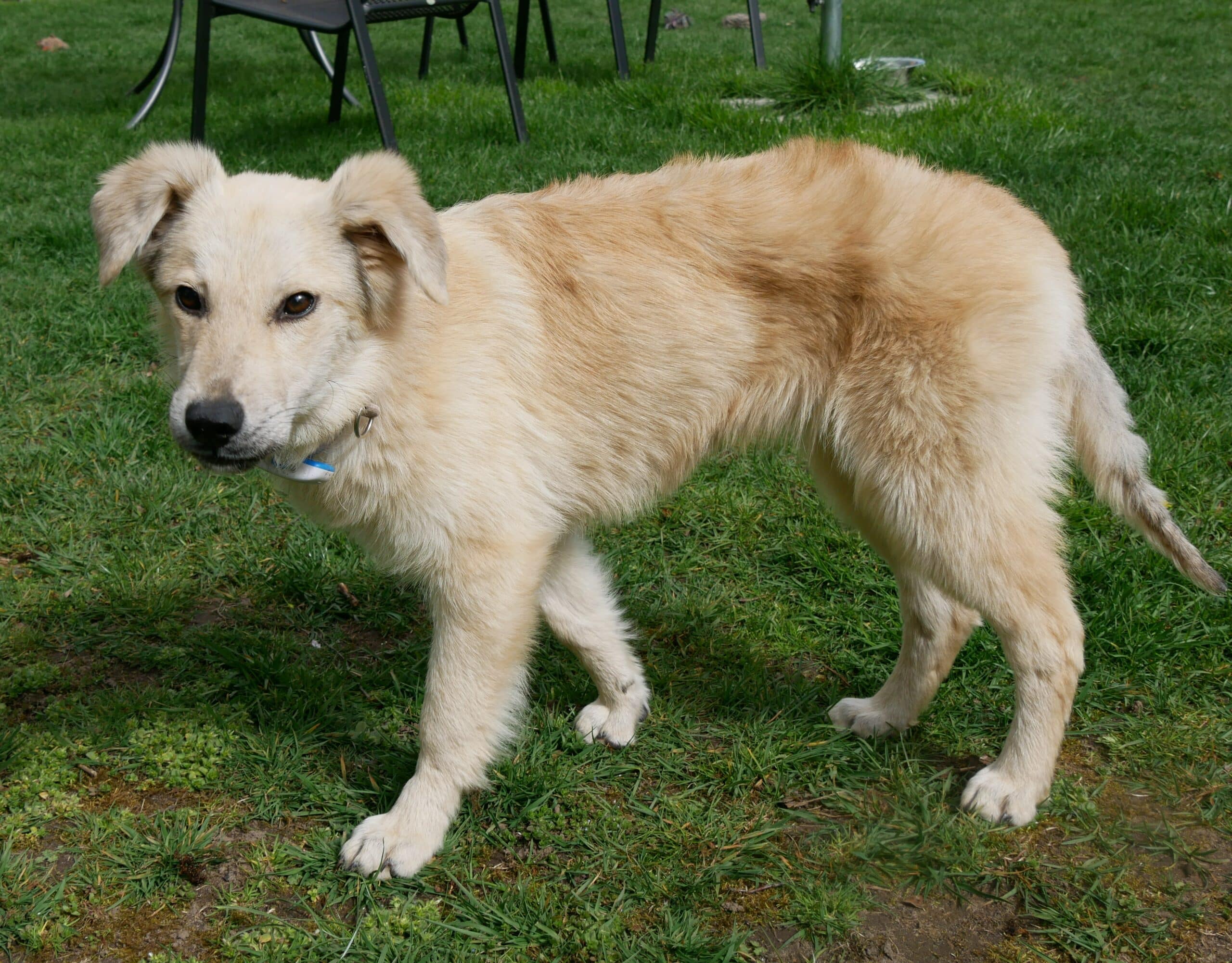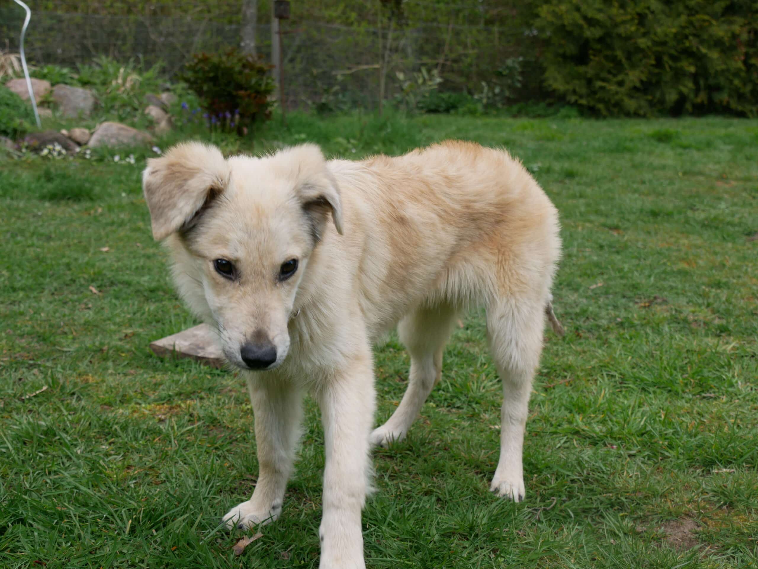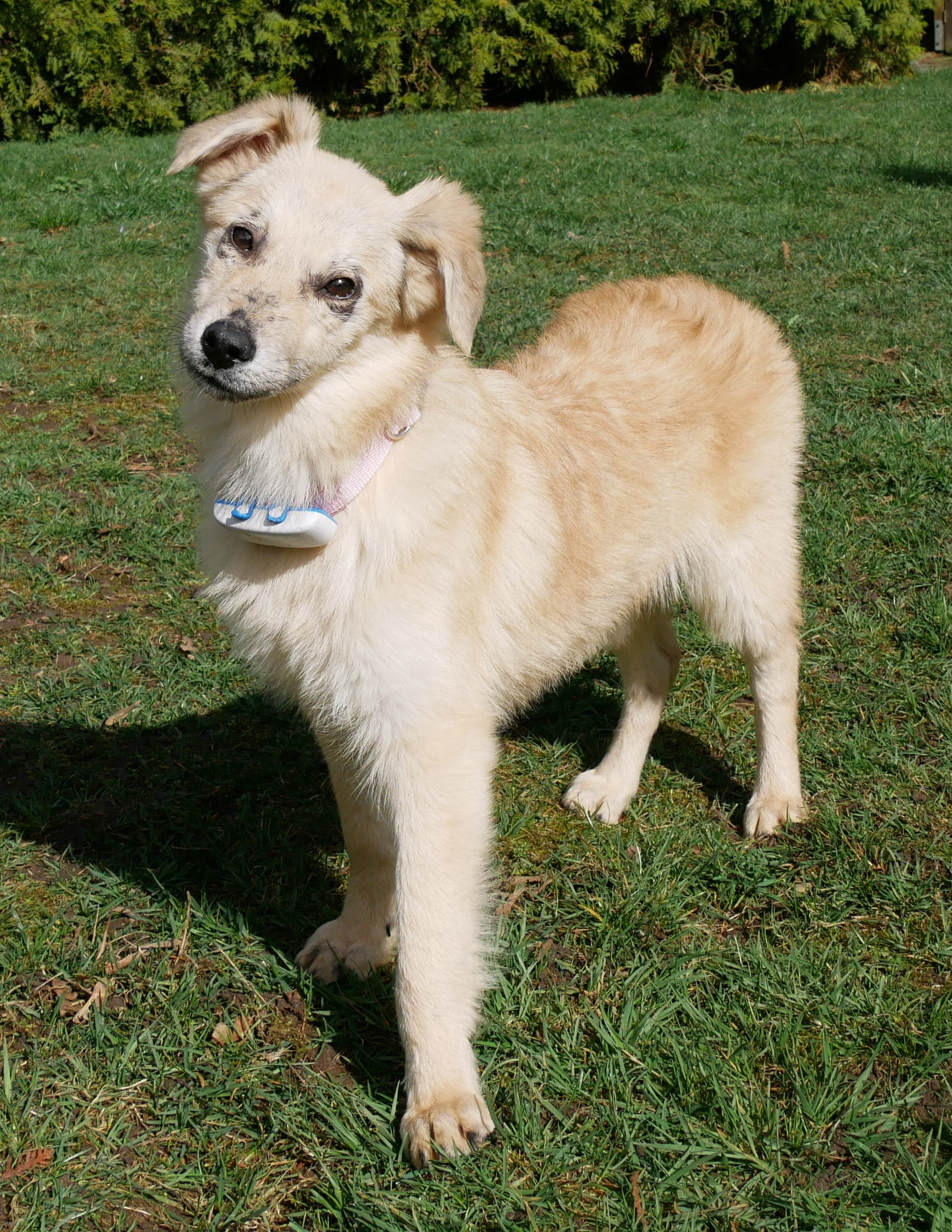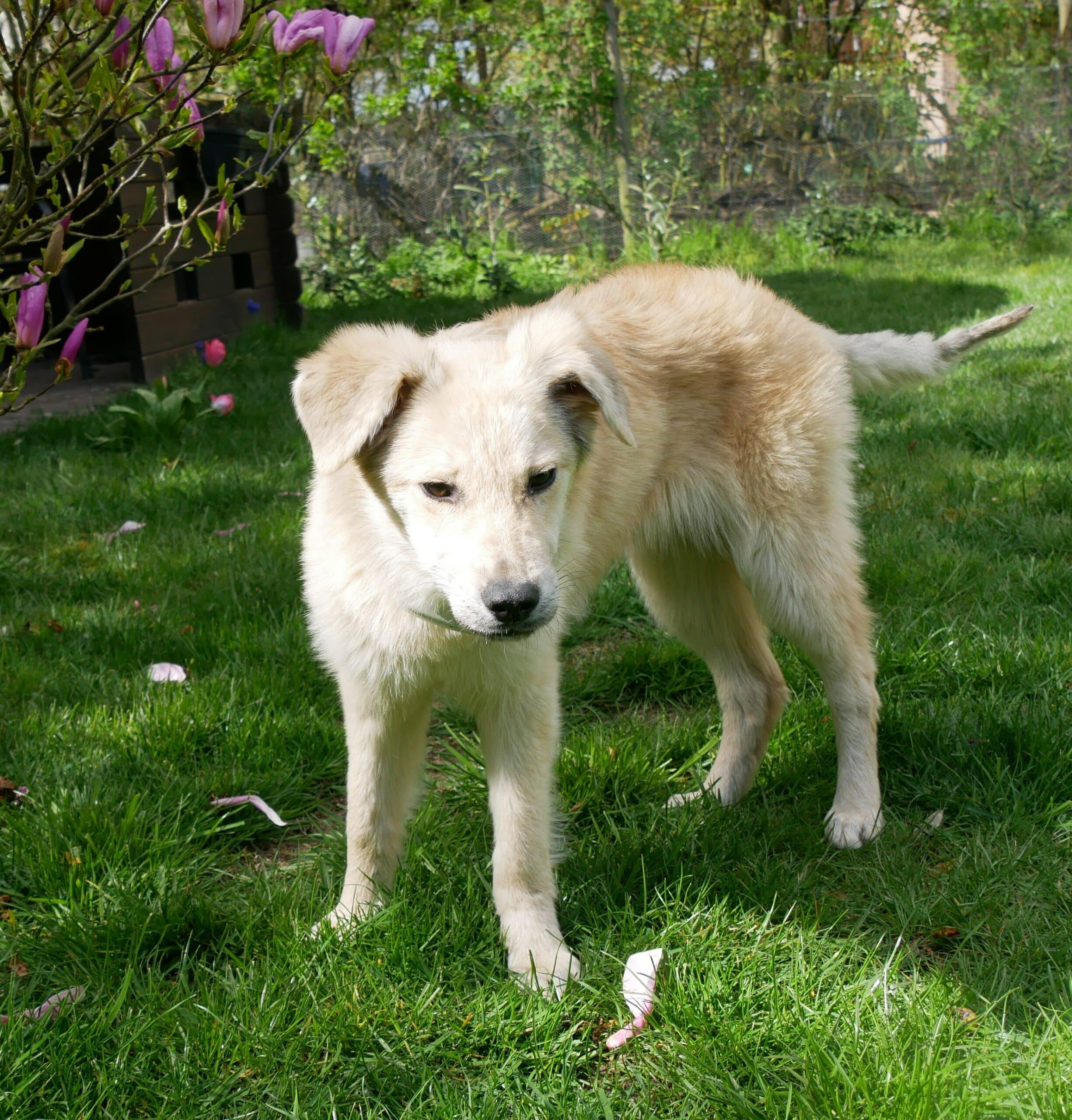 Vom Wesen her ist sie mutiger geworden; wir haben jetzt einige Stadt-Situationen geübt und das klappt ganz gut. Fremden Menschen muss sie erst mal vorsichtig begegnen; das Eis bricht aber schnell, dann mag sie gerne Kontakt und gekuschelt werden. Die Nachbarskinder findet sie toll, gerne tobt sie auch mit ihnen durch den Garten.